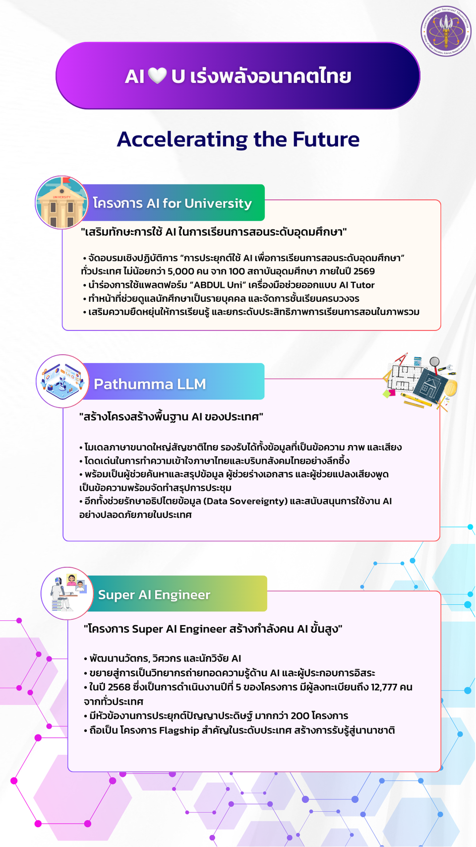 กลุ่มที่ห้า “AI love U (เอไอเลิฟยู) เร่งพลังอนาคตไทย Accelerating the Future” ผมได้ลงนามประกาศกระทรวง อว. เรื่อง “แนวปฏิบัติเกี่ยวกับการจัดการเรียนการสอนด้านปัญญาประดิษฐ์ (AI) ในหลักสูตรการศึกษาของสถาบันอุดมศึกษา พ.ศ. 2568” เพื่อยกระดับการศึกษาให้ทันสมัย รองรับตลาดแรงงานที่เปลี่ยนแปลงเร็ว เป้าหมายคือสร้างบัณฑิตที่มีทักษะพร้อมใช้ AI เป็น ควบคู่กับการพัฒนาระบบนิเวศการศึกษาไทยให้ทันสมัย ประกาศนี้มีผลบังคับใช้ตั้งแต่วันที่ 10 ต.ค. 2568 นอกจากนี้ ยังสนับสนุนการนำ AI มาใช้ประโยชน์ในหลายด้าน เช่น การเฝ้าระวังสุขภาพปอดเชิงรุกด้วย AI Chest X-ray เพื่อเพิ่มโอกาสเข้าถึงการตรวจสุขภาพปอดของประชาชนอย่างเท่าเทียม โดยจะขยายการใช้ AI Chest X-ray สู่ 300 โรงพยาบาล คัดกรองประชาชนในพื้นที่ห่างไกลมากกว่า 300,000 คน อีกทั้งโครงการ “AI คนละครึ่ง” ช่วยสนับสนุนค่าใช้บริการ AI ไทย 50% ให้บริษัทเจ้าของนวัตกรรมภายในเวลาไม่เกิน 1 ปี รวมถึงสนับสนุนโครงการ Super AI Engineer ซึ่งปีล่าสุดมีผู้สมัครกว่า 12,000 คน และก่อให้เกิดผลงานประยุกต์ใช้ปัญญาประดิษฐ์หลายร้อยโครงการ