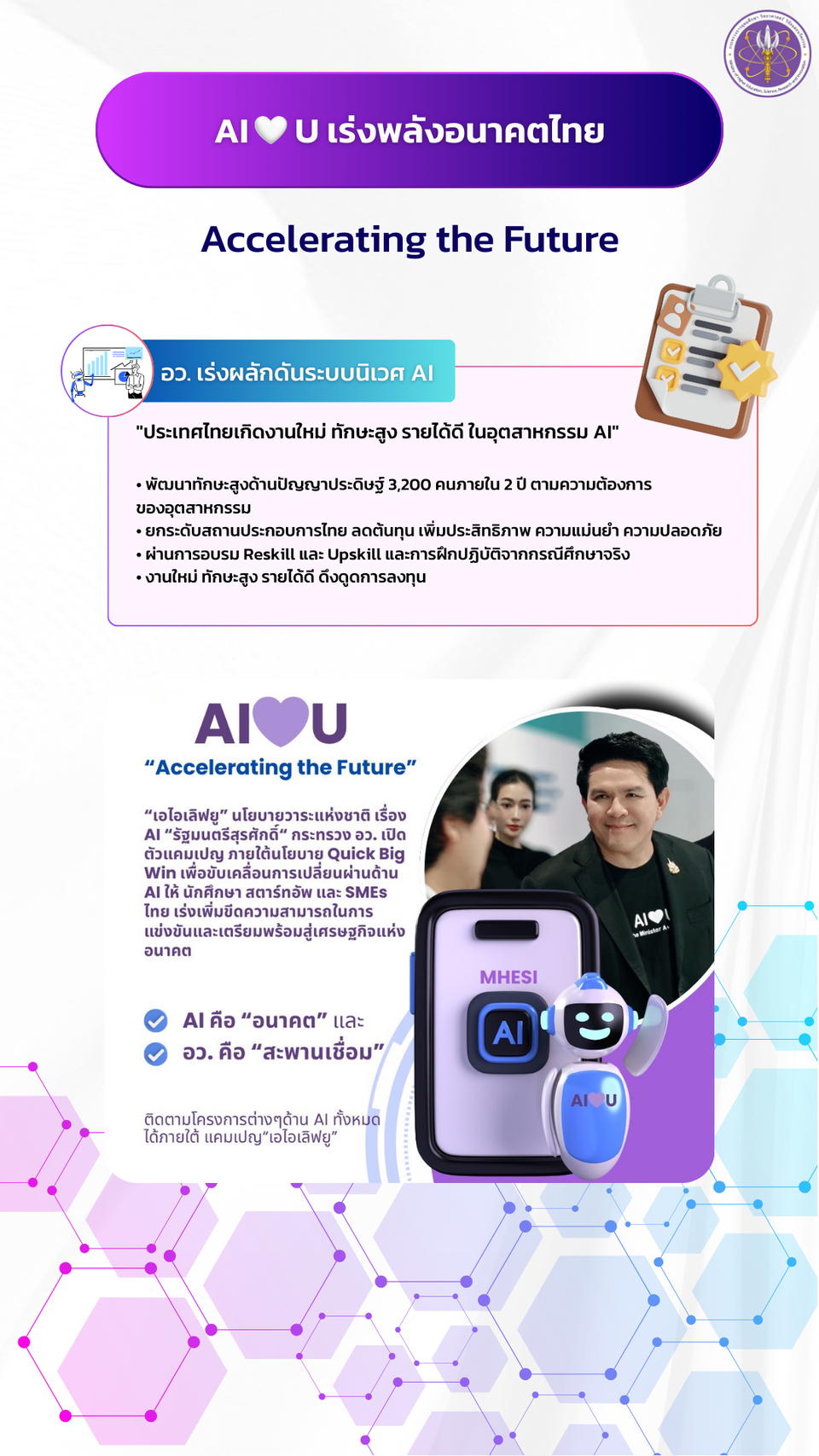 “AI คือ “อนาคต” และกระทรวง อว. คือ “สะพานเชื่อม” สู่โลกยุคใหม่ แคมเปญ AI love U คือการ “สร้างคน” ให้พร้อมกับเศรษฐกิจ AI ตั้งแต่เยาวชน นักศึกษา สตาร์ทอัพ จนถึง SMEs ทั้งหมดนี้อยู่ภายใต้แนวคิด “ก้าวสู่อนาคตใหม่” ด้วยนโยบายที่ให้ผลลัพธ์ที่ชัดเจน เพื่อให้ประเทศไทยพร้อมแข่งขันอย่างมั่นคงและยั่งยืน” นายสุรศักดิ์ กล่าว