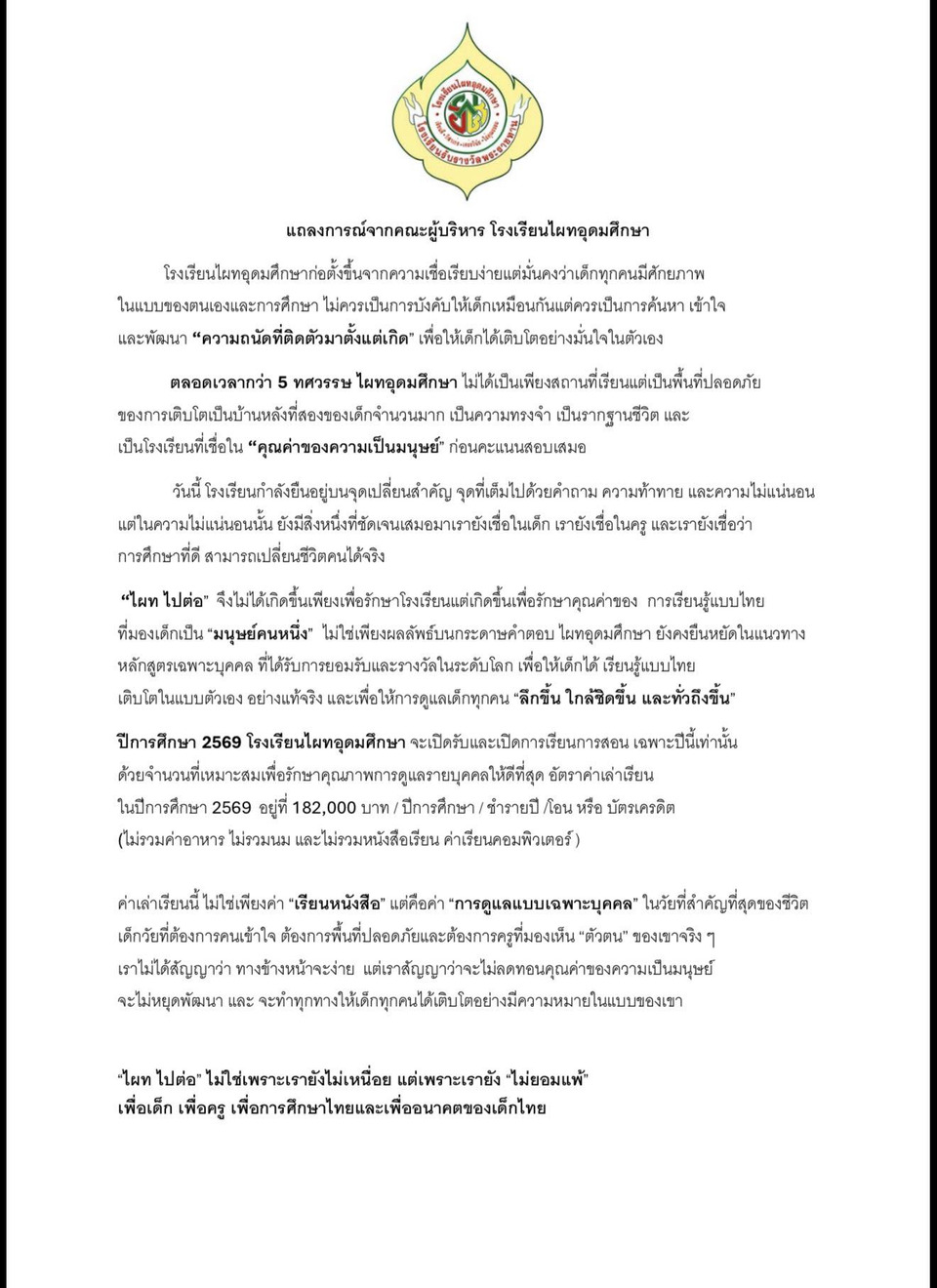 ล่าสุดวันนี้ (7 ม.ค.69) เพจ “Patai Udom Suksa School” โพสต์แถลงการณ์จากคณะผู้บริหารของโรงเรียน ระบุว่า โรงเรียนไผทอุดมศึกษาก่อตั้งขึ้นจากความเชื่อเรียบง่าย แต่มั่นคงว่าเด็กทุกคนมีศักยภาพในแบบของตนเองและการศึกษาไม่ควรเป็นการบังคับให้เด็กเหมือนกัน แต่ควรเป็นการค้นหา เข้าใจ และพัฒนา “ความถนัดที่ติดตัวมาตั้งแต่เกิด” เพื่อให้เด็กได้เติบโตอย่างมั่นใจในตัวเอง