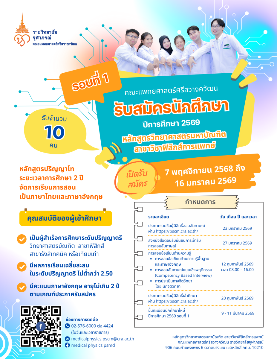 คณะแพทยศาสตร์ศรีสวางควัฒน ราชวิทยาลัยจุฬาภรณ์ ขอเชิญชวนคนรุ่นใหม่ที่มีความมุ่งมั่น มีพลังความตั้งใจ มาเป็นส่วนหนึ่งในการร่วมพัฒนาระบบการแพทย์ไทยและสร้างโอกาสให้ผู้ป่วยมีคุณภาพชีวิตที่ดีขึ้นโดยผู้ที่สนใจสามารถสอบถามข้อมูลเพิ่มเติมได้ที่โทร. 02-576-6000 ต่อ 4424 (ในวันและเวลาราชการ), อีเมล์ medicalphysics.pscm@cra.ac.th,เว็บไซต์ https://pscm.cra.ac.th และติดตามอัปเดตข่าวสารการรับสมัครผ่าน facebook: Medical Physics PSMD (https://www.facebook.com/mppscm)