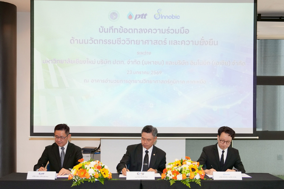 เมื่อวันที่ 23 มกราคม 2569 มหาวิทยาลัยเชียงใหม่ (มช.) ลงนามบันทึกข้อตกลงความร่วมมือด้านนวัตกรรมชีววิทยาศาสตร์และความยั่งยืน ร่วมกับ บริษัท ปตท. จำกัด (มหาชน) และ บริษัท อินโนบิก (เอเซีย) จำกัด โดยมีเป้าหมายเพื่อส่งเสริมการพัฒนาประเทศในมิติเศรษฐกิจ สังคม และสิ่งแวดล้อมอย่างยั่งยืน ผ่านการบูรณาการองค์ความรู้ งานวิจัย และนวัตกรรมสู่การใช้ประโยชน์จริง โดยพิธีลงนามในครั้งนี้ ได้รับเกียรติจาก ศาสตราจารย์ ดร.นพ.พงษ์รักษ์ ศรีบัณฑิตมงคล อธิการบดีมหาวิทยาลัยเชียงใหม่ ร่วมด้วย ดร.บุรณิน รัตนสมบัติ ประธานเจ้าหน้าที่ปฏิบัติการกลุ่มธุรกิจใหม่และความยั่งยืน บริษัท ปตท. จำกัด (มหาชน) และ ดร.ณัฐ อธิวิทวัส กรรมการผู้จัดการใหญ่ บริษัท อินโนบิก (เอเซีย) จำกัด ร่วมลงนามบันทึกข้อตกลงดังกล่าว