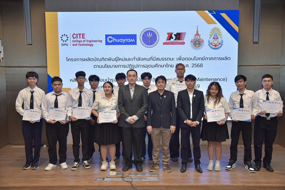 มหาวิทยาลัยธุรกิจบัณฑิตย์ (DPU) โดยวิทยาลัยวิศวกรรมศาสตร์และเทคโนโลยี (CITE) จัดพิธีปิดโครงการบัณฑิตพันธุ์ใหม่ หลักสูตร “การซ่อมบำรุงยานยนต์สมัยใหม่” เมื่อวันที่ 18 มกราคม 2569 ณ ห้องประชุมสัจจา เกตุทัต เพื่อสรุปผลการพัฒนากำลังคนสมรรถนะสูงป้อนกลุ่มอุตสาหกรรมเครื่องยนต์อัจฉริยะ (New Growth Engine) หลังดำเนินงานบ่มเพาะทักษะวิชาชีพอย่างเข้มข้นตลอดระยะเวลา 7 เดือน ตั้งแต่เดือนมิถุนายน 2568 ที่ผ่านมา โดยมีผู้เข้าร่วมและผ่านการอบรมจำนวนทั้งสิ้น 60 คน