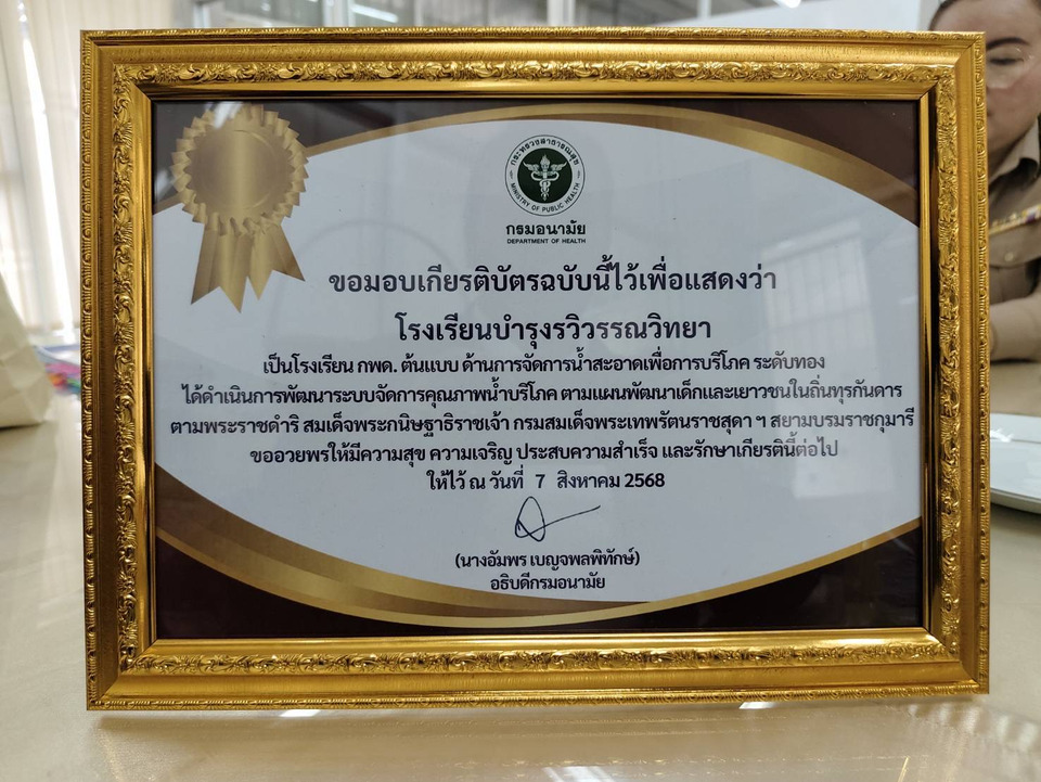 วันศุกร์ที่ 23 มกราคม 2569 สถาบันพัฒนาสุขภาวะเขตเมือง กรมอนามัย มอบเกียรติบัตรให้กับโรงเรียนในโครงการพัฒนาเด็กและเยาวชนในถิ่นทุรกันดารตามพระราชดำริ (กพด.) สมเด็จพระกนิษฐาธิราชเจ้า กรมสมเด็จพระเทพรัตนราชสุดาฯ สยามบรมราชกุมารี โดย นางสาวรัสรินทร์ รวงผึ้งวีระโชติ ผู้อำนวยการสถานศึกษา โรงเรียนบำรุงรวิวรรณวิทยาได้รับรางวัลต้นแบบด้านการจัดการน้ำสะอาดเพื่อการบริโภค "ระดับทอง" พร้อมทั้งจัดฝึกอบรมพัฒนาศักยภาพบุคลากรด้านการส่งเสริมโภชนาการ และสุขอนามัยเด็กและเยาวชนของโรงเรียนในถิ่นทุรกันดาร (กพด.) ขึ้นในวันที่ 23 มกราคม 2569 เวลา 08.30-16.30 น. ณ โรงแรมเบสท์ เวสเทิร์น นาดา ดอนเมือง แอร์พอร์ต เขตบางเขน กรุงเทพมหานคร โดยมีศึกษานิเทศก์ ดร.วีระชาติ ภาษีชา ผู้ดูแลสถานศึกษาในโครงการพัฒนาเด็กและเยาวชนตามพระราชดำริ (กพด.) พื้นที่กรุงเทพมหานคร