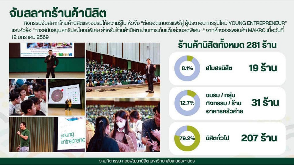 “ปีนี้เป็นครั้งแรกที่ 19 สโมสรนิสิตจากทุกคณะ รวมพลังออกร้านค้าสร้างสรรค์จากทั้งหมด 281 ร้าน นิสิตจะได้เรียนรู้การบริหารธุรกิจครบวงจร ตั้งแต่บัญชีต้นทุน การตลาดดิจิทัล ไปจนถึงมาตรฐาน Food Safety และการจัดการสิ่งแวดล้อมตามแนวทาง Green University ”
