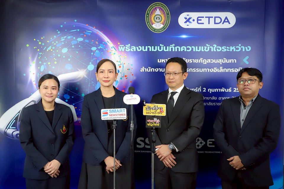 เมื่อวันที่ 2 ก.พ.69 มหาวิทยาลัยราชภัฏสวนสุนันทา จัดพิธีลงนามบันทึกความเข้าใจ (MOU) ร่วมกับสำนักงานพัฒนาธุรกรรมทางอิเล็กทรอนิกส์ (ETDA) ณ ห้องประชุมสภามหาวิทยาลัย อาคาร 31 ชั้น 5 เพื่อขับเคลื่อนความร่วมมือด้านวิชาการ งานวิจัย และการพัฒนาศักยภาพบุคลากรและนักศึกษา ในมิติเทคโนโลยีดิจิทัลและธุรกรรมทางอิเล็กทรอนิกส์อย่างเป็นระบบ