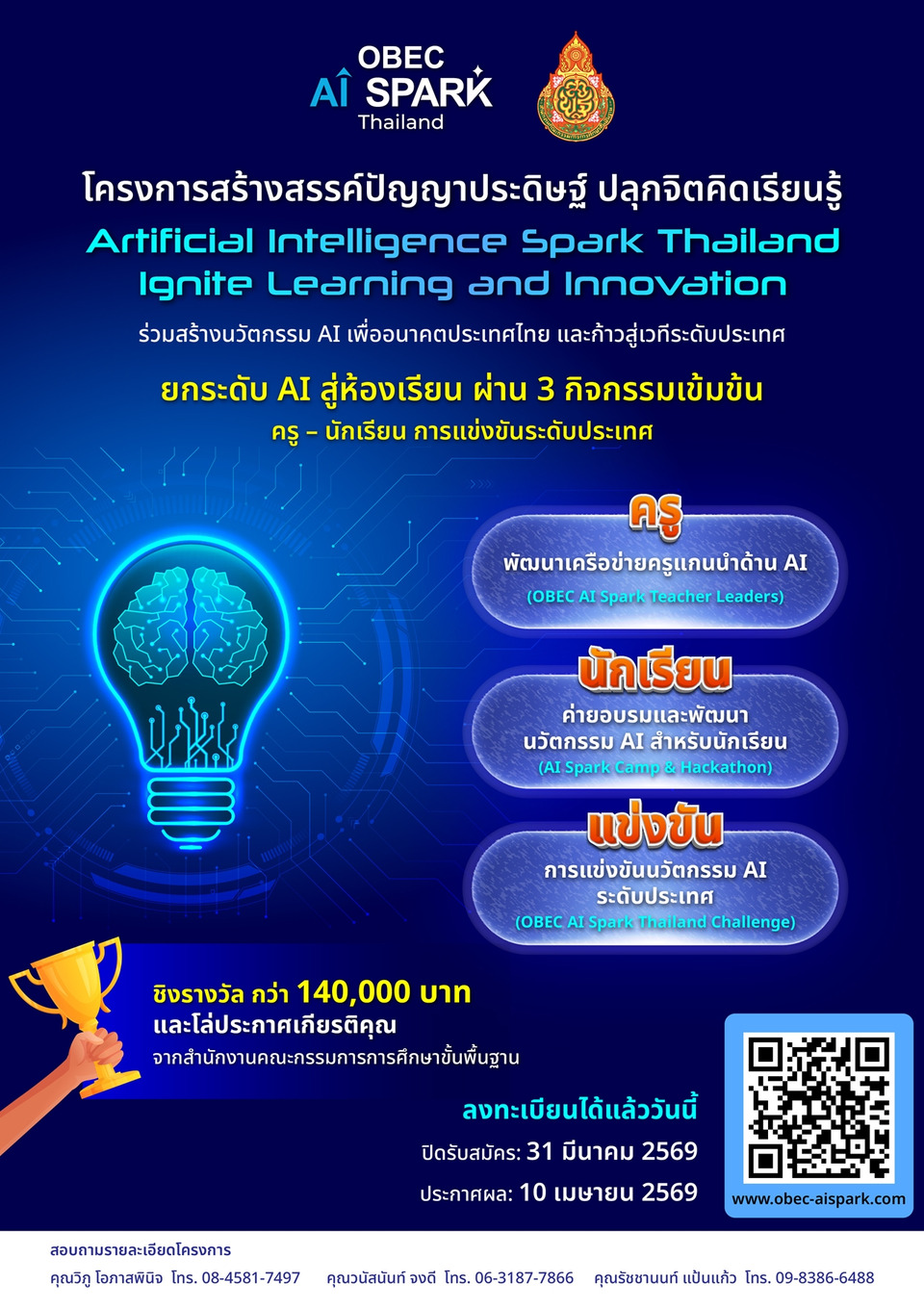 สพฐ.เดินหน้าโครงการ “OBEC AI Spark Thailand” พัฒนาครูและนักเรียนมัธยมปลายทั่วประเทศ เสริมทักษะปัญญาประดิษฐ์ผ่านค่าย อบรม และแข่งขันนวัตกรรม AI ระดับประเทศ เปิดรับสมัครถึง 31 มี.ค.2569