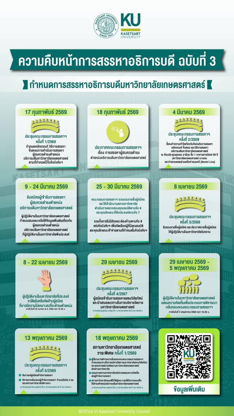 วันที่ 18 ก.พ.69 มหาวิทยาลัยเกษตรศาสตร์ ได้ออกประกาศคณะกรรมการสรรหาผู้สมควรดำรงตำแหน่งอธิการบดี เรื่อง การสรรหาผู้สมควรดำรงตำแหน่งอธิการบดีมหาวิทยาลัยเกษตรศาสตร์ ลงวันที่ 18 กุมภาพันธ์ 2569 เพื่อเปิดกระบวนการสรรหาบุคคลที่มีคุณสมบัติและคุณลักษณะเหมาะสม เข้าดำรงตำแหน่งอธิการบดี ซึ่งเป็นตำแหน่งผู้นำสูงสุดด้านวิชาการและการบริหารของมหาวิทยาลัย