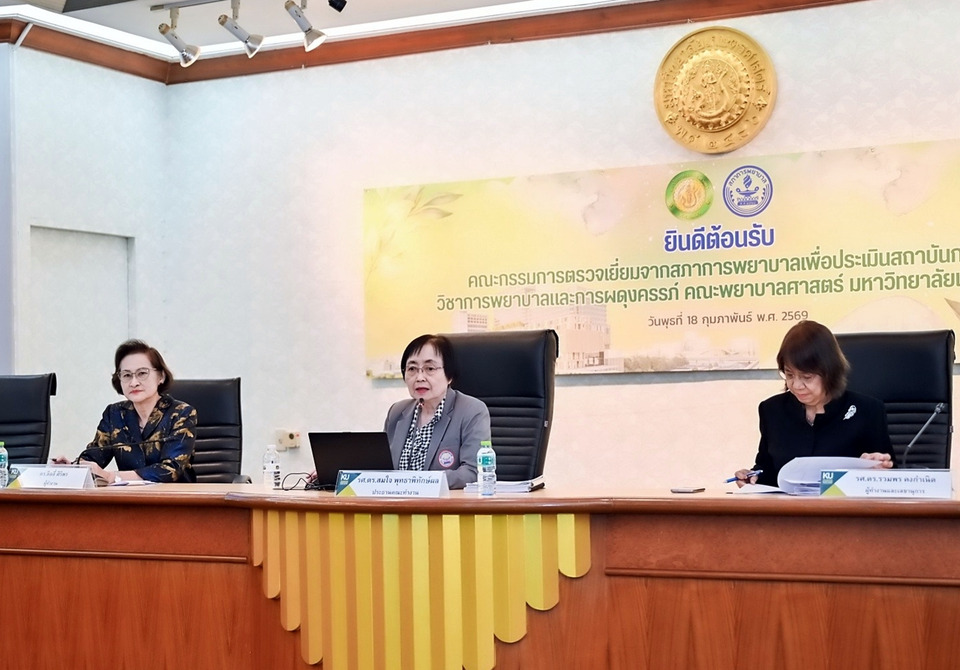 เมื่อวันที่ 18 ก.พ.69 คณะพยาบาลศาสตร์ มหาวิทยาลัยเกษตรศาสตร์ ให้การต้อนรับคณะทำงานตรวจเยี่ยมและประเมินสถาบันการศึกษาวิชาการพยาบาลและการผดุงครรภ์จากสภาการพยาบาล โดยมี ดร.ดำรงค์ ศรีพระราม รักษาการแทนอธิการบดีมหาวิทยาลัยเกษตรศาสตร์ เป็นประธานกล่าวต้อนรับ พร้อมด้วยคณะผู้บริหารมหาวิทยาลัยเข้าร่วมรับฟังการนำเสนอผลการดำเนินงานและผลการตรวจเยี่ยม ณ ห้องประชุมกำพล อดุลวิทย์ อาคารสารนิเทศ 50 ปี มหาวิทยาลัยเกษตรศาสตร์