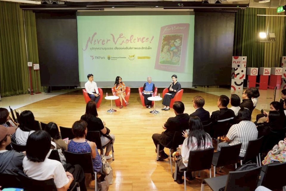 หนังสือ “Never Violence! ยุติทุกความรุนแรง: เสียงแห่งสันติภาพและสิทธิเด็ก” เป็นผลงานของ แอสตริด ลินด์เกรน (Astrid Lindgren) นักเขียนวรรณกรรมเด็กชาวสวีเดน เจ้าของผลงาน “ปิ๊ปปี้ ถุงเท้ายาว” เคยถ่ายทอดผ่านบทกวีและสุนทรพจน์ที่ได้รับการยอมรับในระดับนานาชาติ และมีส่วนผลักดันให้สวีเดนเป็นประเทศแรกของโลกที่ผ่านกฎหมายห้ามลงโทษเด็กทางร่างกายในทุกรูปแบบ ขณะที่ประเทศไทยเพิ่งผ่านกฎหมายนี้ในปีที่ผ่านมา ทำให้การจัดงานครั้งนี้มีความหมายเป็นพิเศษในฐานะ “พื้นที่สาธารณะ” ที่ชวนสังคมกลับมาทบทวนว่า การปกป้องสิทธิเด็กไม่ได้จบที่ตัวบทกฎหมาย แต่เริ่มได้จากการรับฟัง ความเข้าใจ และความสัมพันธ์ที่ไม่ใช้ความรุนแรงในชีวิตประจำวัน