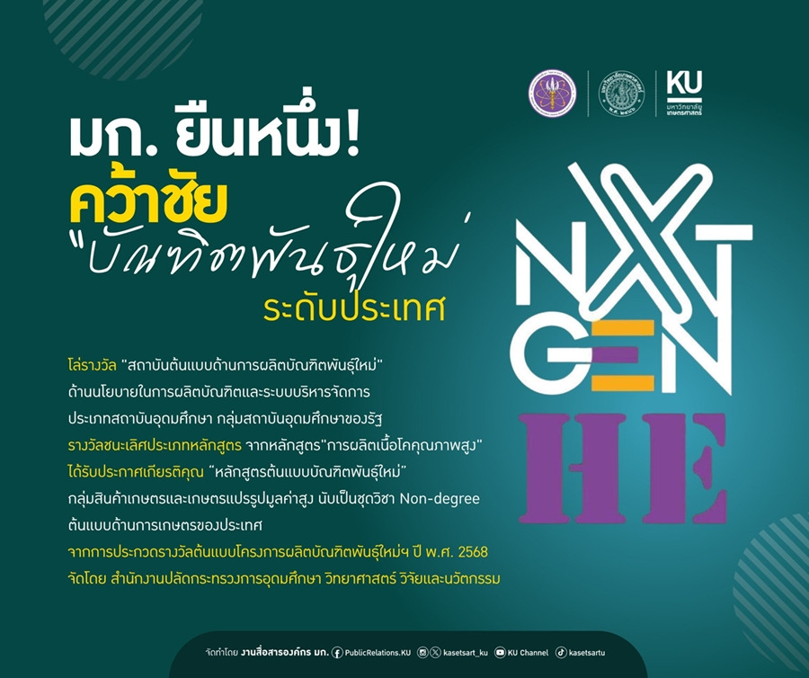 มหาวิทยาลัยเกษตรศาสตร์ สร้างความภาคภูมิใจและความเชื่อมั่นให้กับวงวิชาการอุดมศึกษาไทย ได้รับรางวัลชนะเลิศ ลำดับที่ 1 โล่รางวัล “สถาบันต้นแบบด้านการผลิตบัณฑิตพันธุ์ใหม่” ด้านนโยบายการผลิตบัณฑิตและระบบบริหารจัดการ ประเภทสถาบันอุดมศึกษา กลุ่มสถาบันอุดมศึกษาของรัฐ จากการประกวด รางวัลต้นแบบโครงการผลิตบัณฑิตพันธุ์ใหม่ ฯ ประจำปี พ.ศ. 2568 จัดโดย สำนักงานปลัดกระทรวงการอุดมศึกษา วิทยาศาสตร์ วิจัยและนวัตกรรม เพื่อยกย่องสถาบันอุดมศึกษาที่มีบทบาทโดดเด่นในการพัฒนากำลังคนสมรรถนะสูง สำหรับอุตสาหกรรม New Growth Engine รองรับทิศทางการพัฒนาประเทศ ภายใต้นโยบาย Thailand 4.0 และการปฏิรูปการอุดมศึกษาไทย ความสำเร็จครั้งนี้ตอกย้ำบทบาทผู้นำของมหาวิทยาลัยเกษตรศาสตร์ในการปฏิรูปการอุดมศึกษาไทย โดยเฉพาะการขับเคลื่อนเชิงนโยบายและการพัฒนาหลักสูตรผ่านวิทยาลัยบูรณาการศาสตร์ มหาวิทยาลัยเกษตรศาสตร์ ที่มุ่งสร้างกำลังคนคุณภาพสูงให้สอดคล้องกับความต้องการของประเทศในอนาคต