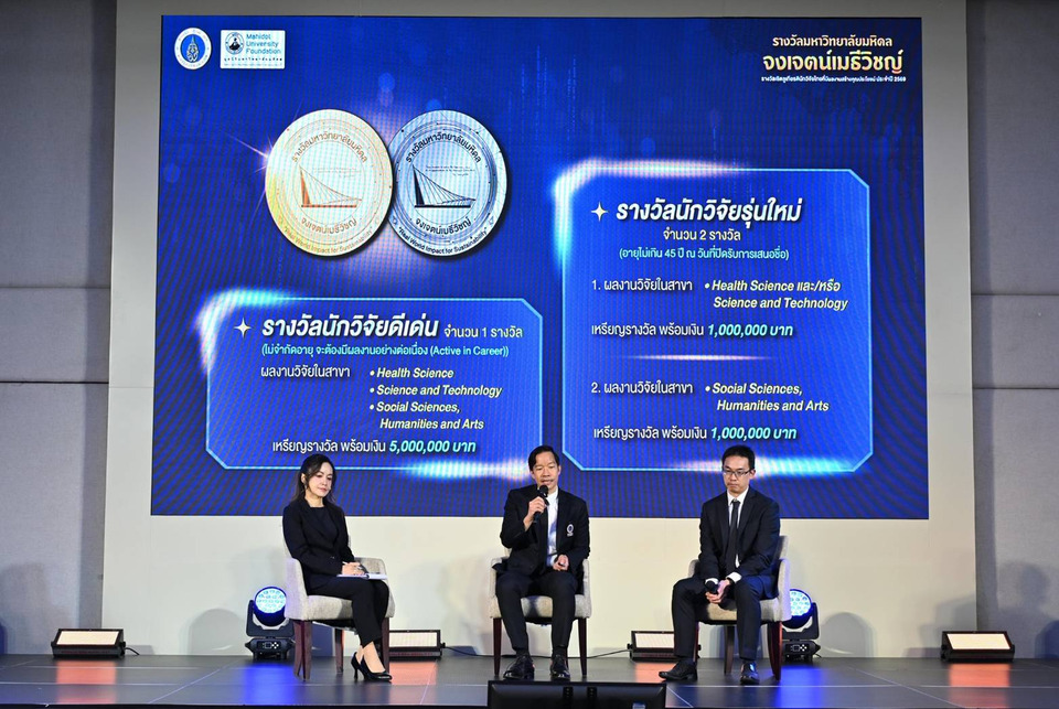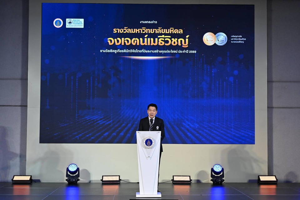 มหาวิทยาลัยมหิดล ตอกย้ำบทบาทผู้นำด้านการวิจัยและพัฒนานวัตกรรมที่มุ่งสร้างผลลัพธ์ที่จับต้องได้ เดินหน้าจัดงาน “รางวัลมหาวิทยาลัยมหิดล จงเจตน์เมธีวิชญ์” ประจำปี 2569 ต่อเนื่องเป็นปีที่ 2 เพื่อยกย่องนักวิจัยไทยที่มีผลงานโดดเด่นและสร้างผลกระทบเชิงบวกต่อประเทศ ภายใต้แนวคิด "Real World Impact for Sustainability" โดยครอบคลุม 3 สาขาหลัก ได้แก่ วิทยาศาสตร์สุขภาพ วิทยาศาสตร์และเทคโนโลยี และสังคมศาสตร์ มนุษยศาสตร์และศิลปศาสตร์ โดยมอบเงินรางวัลสูงสุด 7 ล้านบาท ในรูปแบบทุนให้เปล่าไม่มีข้อผูกมัด พร้อมมุ่งยกระดับเป็นรางวัลทรงเกียรติระดับประเทศ ทั้งนี้ รางวัลดังกล่าวเปรียบเสมือนรางวัลโนเบลของประเทศไทย กลไกสำคัญในการวางรากฐานระบบนิเวศการวิจัยที่เข้มแข็งและผลักดันสู่การใช้ประโยชน์จริงทั้งในเชิงเศรษฐกิจ สังคม และคุณภาพชีวิต