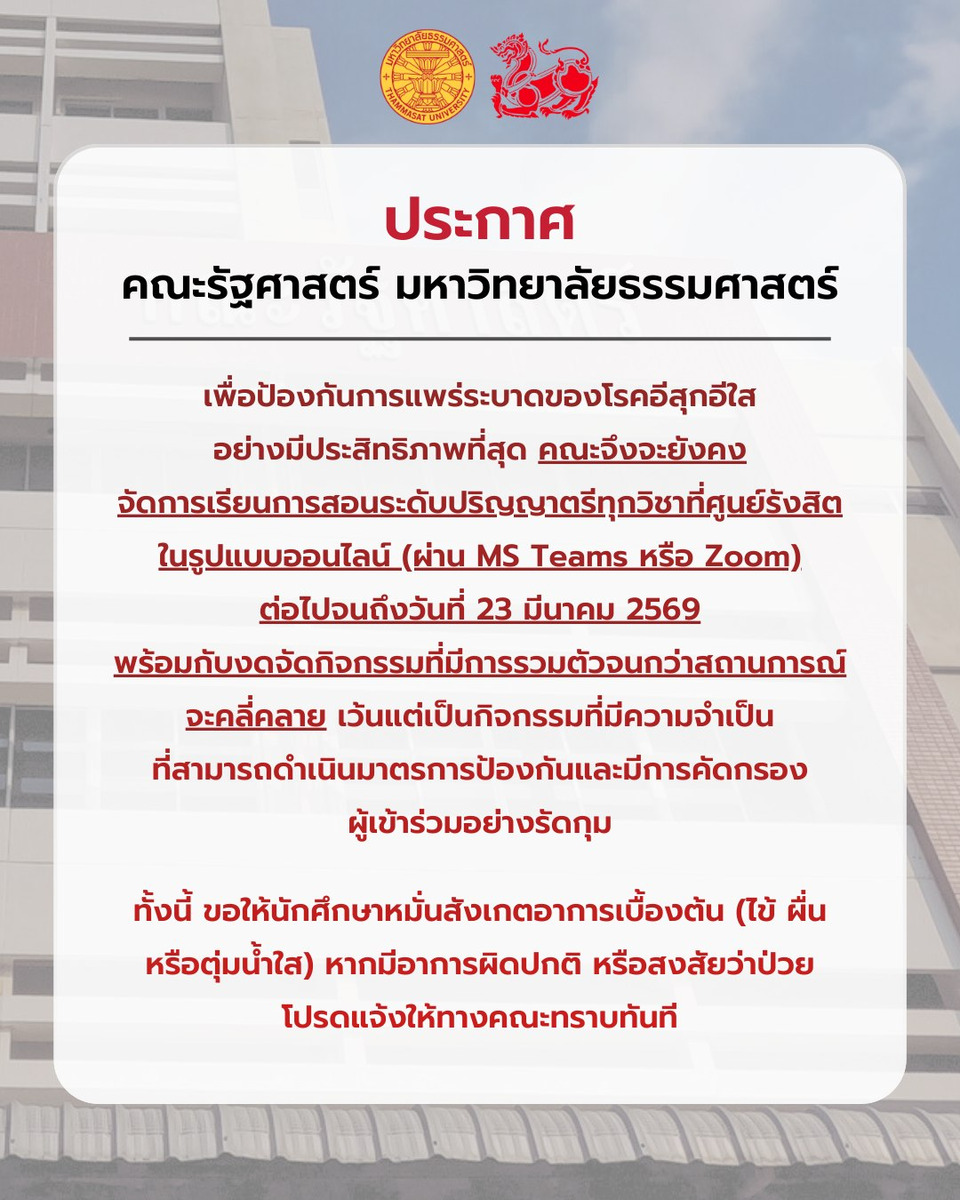 คณะรัฐศาสตร์ มธ. จะยังคงจัดการเรียนการสอนระดับปริญญาตรีที่ศูนย์รังสิตในรูปแบบออนไลน์ต่อไปถึงวันที่ 23 มี.ค. 69