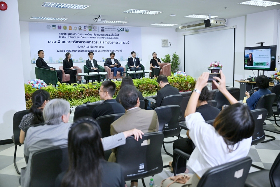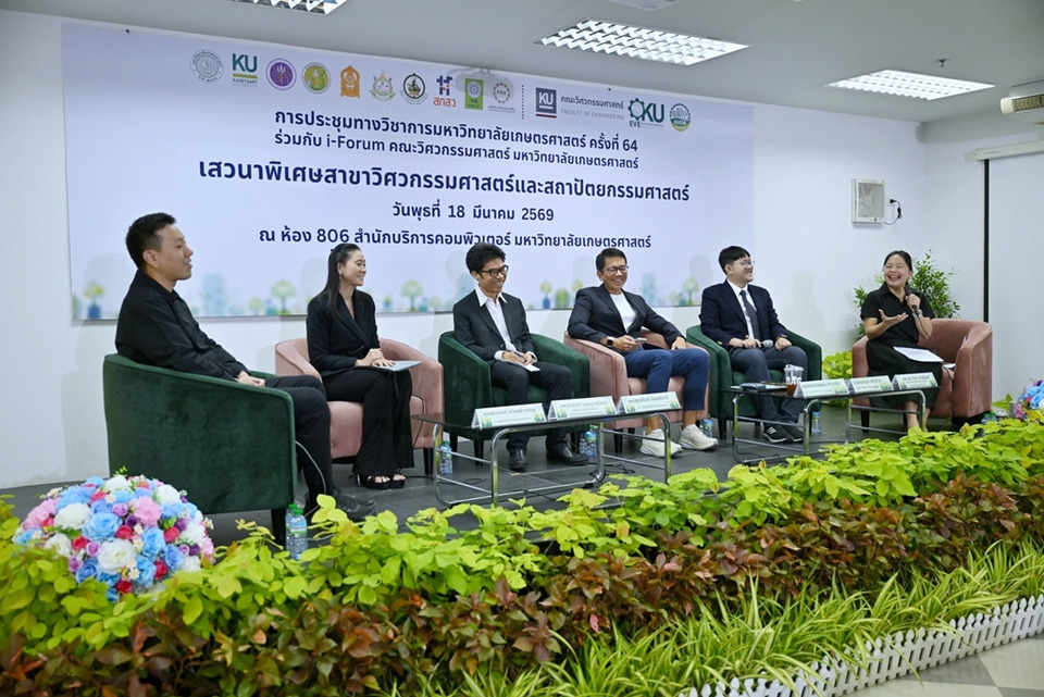 ดร.สวนิตย์ บุญญาสุวัฒน์ คณะทำงาน BCG Model สภาอุตสาหกรรมแห่งประเทศไทย กล่าวถึงความท้าทายในการดำเนินธุรกิจในงานเสวนาพิเศษ “วิศวกรรมเพื่อโลกที่ยั่งยืน: รับมือประเด็นสิ่งแวดล้อมอุบัติใหม่” ในงานการประชุมทางวิชาการมหาวิทยาลัยเกษตรศาสตร์ ครั้งที่ 64 วันที่ 18 มีนาคม 2569 ณ ห้อง 806 ชั้น 8 สำนักบริการคอมพิวเตอร์ มหาวิทยาลัยเกษตรศาสตร์ ว่า “สหภาพยุโรป (EU) มีกติกาการค้าที่เข้มงวด โดยมุ่งเน้นมาตรฐานความปลอดภัยของอาหาร สวัสดิภาพสัตว์ การตรวจสอบย้อนกลับ และสิ่งแวดล้อม ถึงแม้ทิศทางดูชะลอลงเนื่องจากสงครามที่เกิดขึ้น แต่นั่นเป็นแนวโน้มทิศทางที่ทั่วโลกและประเทศไทยต้องดำเนินไป และตอนนี้รัฐบาลก็เริ่มสนใจเชื้อเพลิงชีวภาพ หากเราส่งเสริมการลงทุนในแนวคิดการดำเนินธุรกิจที่มุ่งเน้นความยั่งยืน โดยคำนึงถึงสิ่งแวดล้อม (E) สังคม (S) และการกำกับดูแลกิจการ (G) รวมถึงส่งเสริมพลังงานหมุนเวียน ยิ่งส่งเสริมพลังงานหมุนเวียนก็จะก่อมลพิษลดลง ตอนนี้สถานการณ์เปลี่ยน ประเทศไทยมีความพร้อมในหลาย ๆ ด้าน ถ้าเราสามารถร่วมมือกันทำโปรเจกต์ใหม่ที่ตอบโจทย์สถานการณ์โลกที่เปลี่ยนแปลงได้ เราก็สามารถขับเคลื่อนประเทศไปในแบบของเราได้”