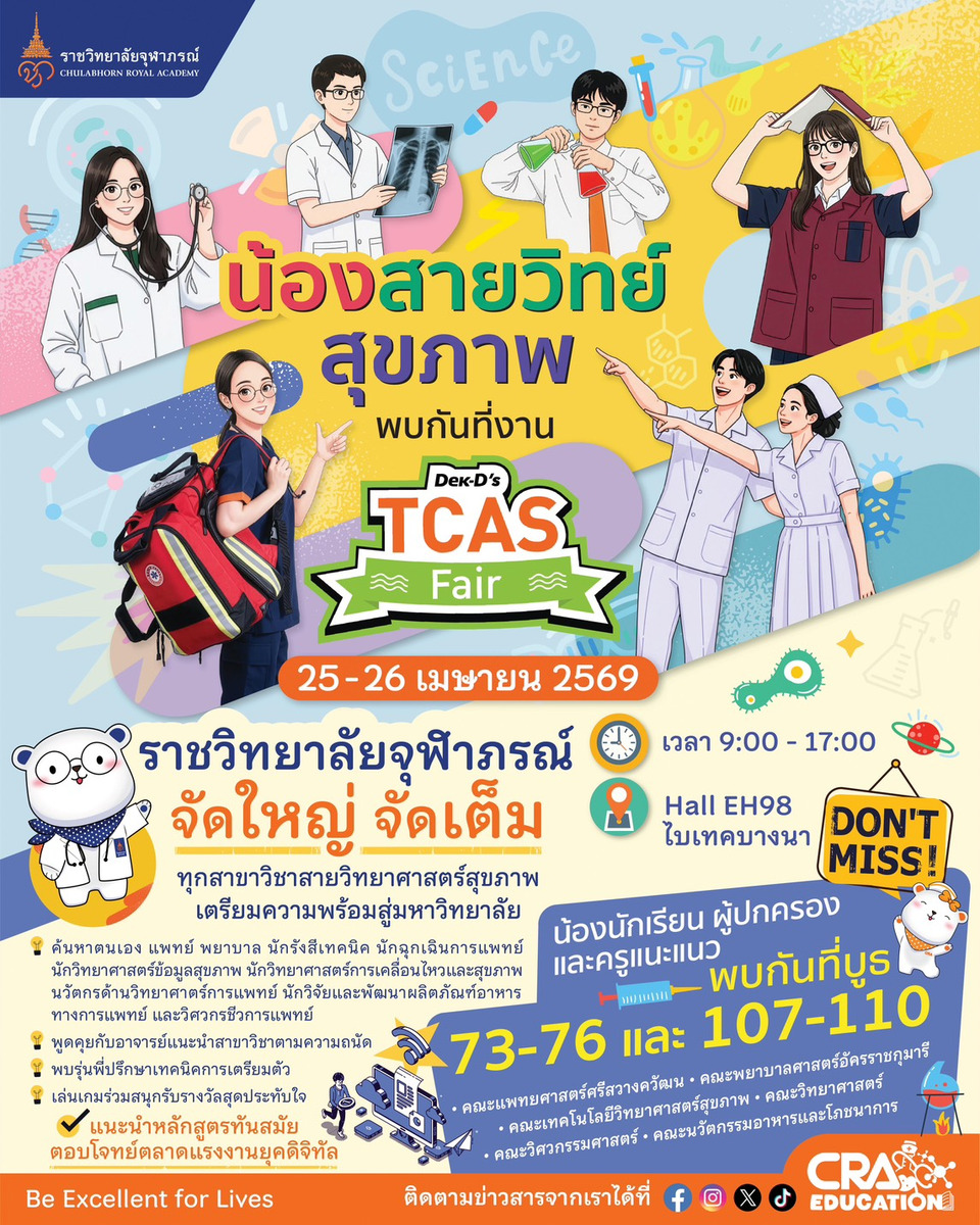 ราชวิทยาลัยจุฬาภรณ์ เตรียมความพร้อมสร้างบุคลากรทางการแพทย์และวิทยาศาสตร์ จัดเต็มกิจกรรมแนะแนวการศึกษาต่อในมหกรรม “Dek-D’s TCAS Fair 2026” พบกับรุ่นพี่และอาจารย์จาก 6 คณะ พร้อมกิจกรรมค้นหาตัวตนและเทคนิคการเตรียมตัวสู่คณะในฝัน ระหว่างวันที่ 25-26 เมษายน 2569 นี้ ณ ฮอลล์ EH98 ไบเทค บางนา