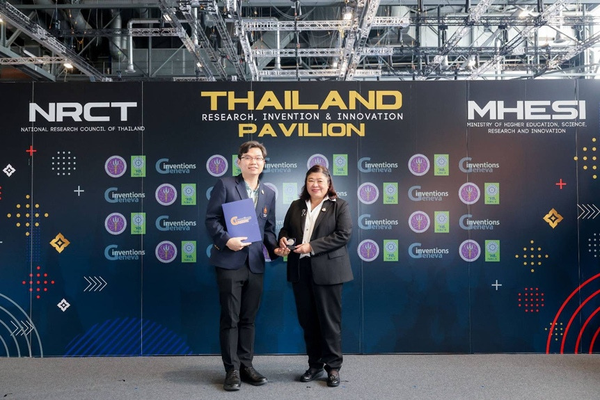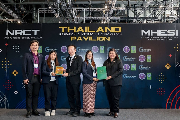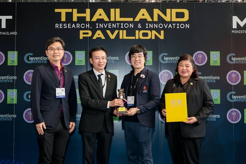 3. นวัตกรรม “Kinec”: คว้ารางวัลเหรียญทองแดง (Bronze Prize) และรางวัลพิเศษ NRCT Honorable Mention Award จาก สำนักงานการวิจัยแห่งชาติ (วช.) เป็นนวัตกรรมฟื้นฟูการเคลื่อนไหวแบบสองข้างสำหรับผู้ป่วยติดเตียง โดยใช้กลไกแรงจากร่างกายผู้ป่วยเองแทนการใช้มอเตอร์ ผสานกับระบบเซนเซอร์และ AI ในการวิเคราะห์การฟื้นตัวของระบบประสาท ช่วยยกระดับคุณภาพชีวิตผู้ป่วยให้กลับมาพึ่งพาตนเองได้ ผลงานโดย ดร.ธันยพร วงศ์วัชรานนท์ , อาจารย์ฉัตรพร เรืองทอง , ดร. อัจฉรียา กสิยะพัท จากคณะเทคโนโลยีวิทยาศาสตร์สุขภาพ ราชวิทยาลัยจุฬาภรณ์ พร้อมด้วย นางสาวชมพูนุท โสธรเทวาพิทักษ์ , นางสาวปณิตรา จันทร์สว่าง และนางสาวกัญญาพร พิมพ์ไธสง นักศึกษาของคณะเทคโนโลยีวิทยาศาสตร์สุขภาพ ราชวิทยาลัยจุฬาภรณ์