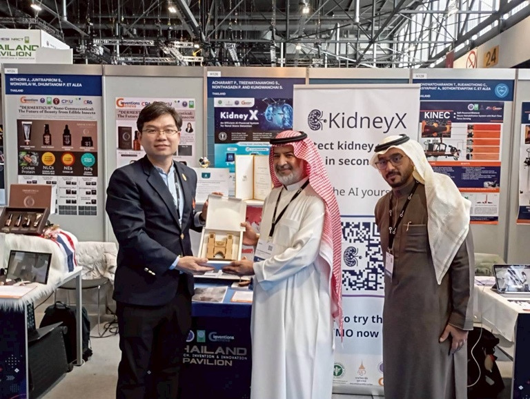 2. นวัตกรรม “KidneyX”: คว้ารางวัลเหรียญเงิน (Silver Prize), รางวัลพิเศษ (Special Prize) จาก สำนักงานการวิจัยแห่งชาติ (วช.) และ รางวัลพิเศษ (Special Prize) Certificate of Innovation Excellence จาก Umm Al-Qura University ประเทศซาอุดีอาระเบีย “KidneyX” เป็นระบบปัญญาประดิษฐ์ (AI) ประสิทธิภาพสูงเพื่อการตรวจจับนิ่วในไตบนภาพรังสี KUB ผลงานโดย ผศ.ดร.ปณิธิ อัจฉราฤทธิ์ คณะแพทยศาสตร์ศรีสวางควัฒน พร้อมด้วย นพ.สุธี ตรีวัฒนาวงศ์ โรงพยาบาลเชียงรายประชานุเคราะห์ และดร.ปวรี นนทะแสน จากคณะแพทยศาสตร์ศรีสวางควัฒน ราชวิทยาลัยจุฬาภรณ์ ออกแบบมาเพื่อช่วยแพทย์ในพื้นที่ห่างไกลให้สามารถวินิจฉัยโรคได้อย่างแม่นยำสูงถึง 95% แม้ในสภาวะที่มีทรัพยากรจำกัด