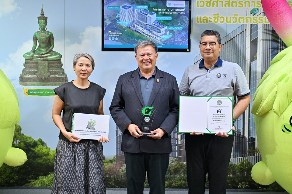 คณะผู้บริหาร มหาวิทยาลัยเกษตรศาสตร์ นำโดย ผศ.ดร.ปารเมศ กำแหงฤทธิรงค์ คณบดีคณะสถาปัตยกรรมศาสตร์ รศ.ดร.ตุลวิทย์ สถาปนจารุ คณบดีคณะสิ่งแวดล้อม ผศ.นท.หญิงดร.งามลมัย ผิวเหลือง คณบดีคณะสังคมศาสตร์ ผศ.ดร.ธงรบ รื่นบันเทิง คณบดีคณะมนุษยศาสตร์ รศ.ดร.ศุภกิตติ์ สายสุนทร รองคณบดีฝ่ายพัฒนากายภาพเเละเทคโนโลยีดิจิทัล และนายประเพลิน เกษมโอภาส ผู้อำนวยการกองกายภาพและสิ่งแวดล้อมยั่งยืน เข้าร่วมงานประกาศเกียรติคุณตราสัญลักษณ์ G-Green ระดับประเทศ (Green Office) ซึ่งจัดโดยกรมการเปลี่ยนแปลงสภาพภูมิอากาศและสิ่งแวดล้อม เพื่อส่งเสริมให้หน่วยงานภาครัฐและเอกชนนําความรู้ที่ได้ไปประยุกต์ใช้และส่งเสริมให้เกิดการปรับเปลี่ยนพฤติกรรมภายในสํานักงาน มีการใช้พลังงานและทรัพยากรอย่างมีประสิทธิภาพ โดยมี ดร.รวีวรรณ ภูริเดช ปลัดกระทรวงทรัพยากรธรรมชาติและสิ่งแวดล้อม เป็นประธานในพิธี เมื่อวันที่ 23 มีนาคม 2569 ณ โรงแรม เซ็นทารา ไลฟ์ ศูนย์ราชการและคอนเวนชันเซ็นเตอร์ แจ้งวัฒนะ กรุงเทพมหานคร