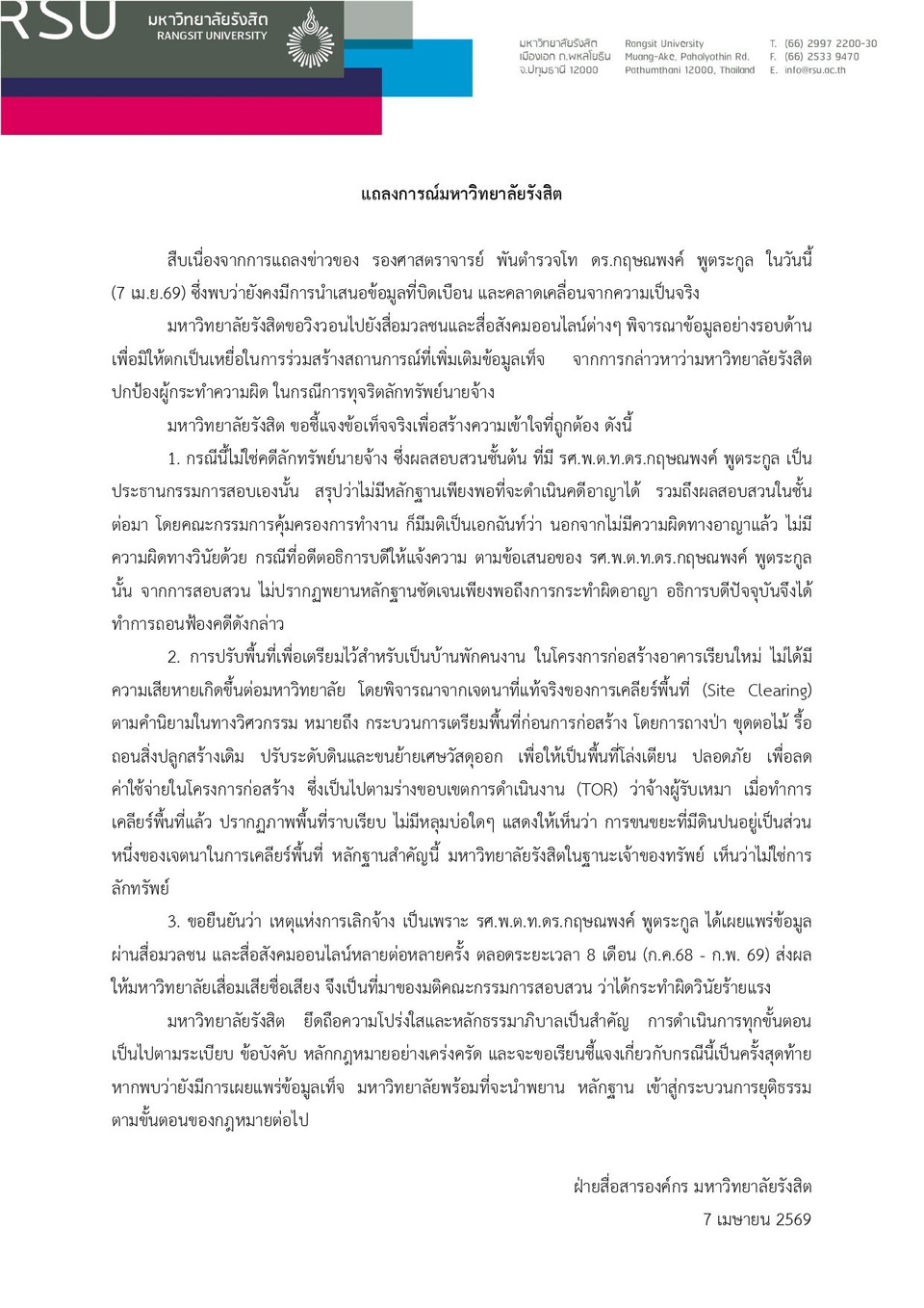 เมื่อวันที่ 8 เมษายน ผู้สื่อข่าวรายงานว่า เมื่อวันที่ 7 เมษายนที่ผ่านมา มหาวิทยาลัยรังสิต ออกแถลงการณ์ ระบุว่า สืบเนื่องจากการแถลงข่าวของ รองศาสตราจารย์ พันตํารวจโท ดร.กฤษณพงค์ พูตระกูล ในวันนี้ (7 เม.ย.69) ซึ่งพบว่ายังคงมีการนําเสนอข้อมูลที่บิดเบือน และคลาดเคลื่อนจากความเป็นจริง