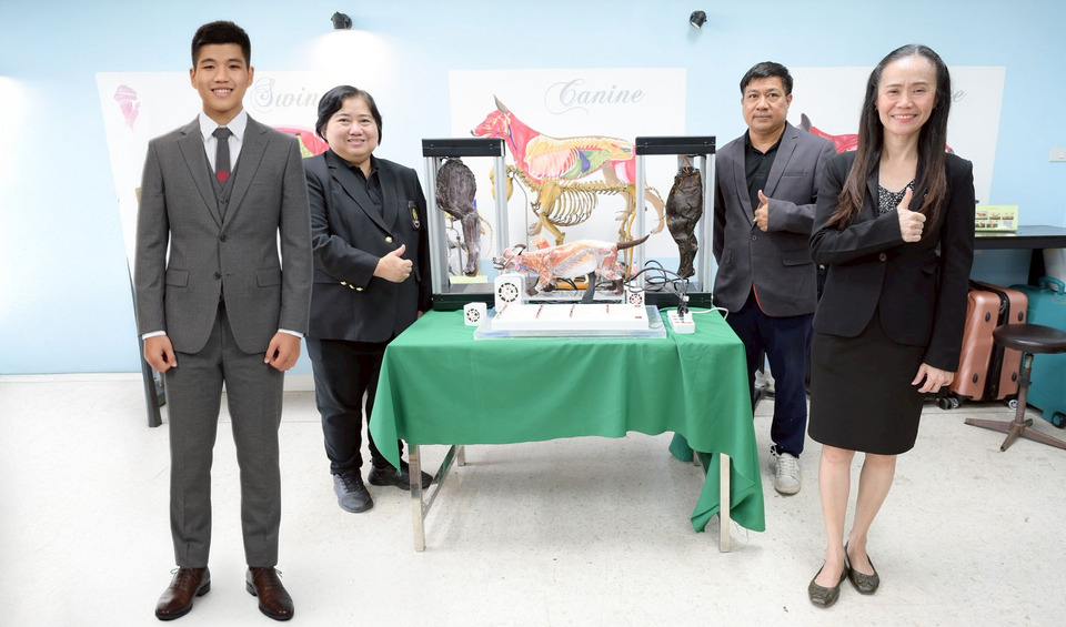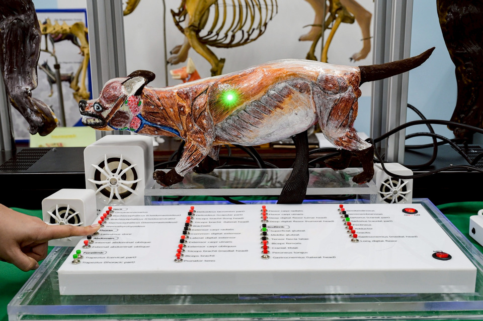 การที่ได้รับรางวัลเหรียญทอง (Gold Medal) และรางวัลยอดเยี่ยมที่สุดในสาขา Best Category Award: Veterinary Medicine เป็นสิ่งยืนยันการยอมรับว่าเป็นผลงานที่ดีที่สุดในสาขาสัตวแพทย์ ผลงานนวัตกรรมหุ่นกายวิภาคของกล้ามเนื้อสุนัขแบบโต้ตอบได้เป็นนวัตกรรมที่ใช้ในการเรียนการสอนกายวิภาคในนิสิตคณะสัตวแพทยศาสตร์ จุฬาฯ ระบบการทำงานเป็นแบบคู่ (Dual-Model) ประกอบด้วย หุ่นแบบ A (LED Topography) เป็นหุ่นสุนัขพันธุ์ชิวาวาขนาดเท่าตัวจริง ติดตั้งไฟ LED 43 จุด ตลอดตัวด้านซ้าย ผู้เรียนสามารถกดปุ่มชื่อกล้ามเนื้อภาษาอังกฤษเพื่อให้ไฟสว่างตามตำแหน่งจริง โดยแยกสีตามหน้าที่ทางสรีรวิทยาอย่างชัดเจน สีแดงเป็นกลุ่มงอทั้งหมด 27 จุด สีดำเป็นกลุ่มเหยียดทั้งหมด 11 จุด และสีเขียวเป็นกลุ่มหุบหรือกางทั้งหมด 5 จุด พร้อมระบบเสียงบรรยาย MP3 เสมือนมีอาจารย์ช่วยสอนอยู่ข้างๆ หุ่นแบบ B (Biomechanical Simulation) เป็นการจำลองกลไกการเคลื่อนที่อัตโนมัติของรยางค์ขาหน้าและขาหลังของสุนัขพันธุ์ไทย หุ่นสามารถจำลององศาการงอเหยียดได้แม่นยำตามหลักกายวิภาค เช่น ข้อศอกที่ 36-166 องศา และข้อเข่าที่ 41-162 องศา ช่วยให้นิสิตเห็นภาพการทำงานของกล้ามเนื้อในขณะสุนัขเคลื่อนไหวจริง ซึ่งร่างอาจารย์ใหญ่ทำไม่ได้