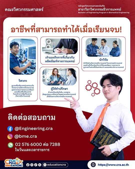 คณะวิศวกรรมศาสตร์ มุ่งมั่นที่จะผลิตบัณฑิตและพัฒนาบุคลากรด้านวิศวกรรมชีวการแพทย์ และวิศวกรรมสมัยใหม่ รวมถึงให้บริการวิชาการ ทำการวิจัยและสร้างนวัตกรรมด้านวิศวกรรมชีวการแพทย์ และวิศวกรรมสมัยใหม่ รวมทั้งดำเนินการด้านวิศวกรรมชีวการแพทย์ และวิศวกรรมสมัยใหม่ เพื่อสนับสนุนในการแก้ไขปัญหาด้านการแพทย์และสุขภาพของประชาชนอย่างมีประสิทธิภาพ สำหรับผู้ที่สนใจร่วมเป็นส่วนหนึ่งของการสร้างนวัตกรรมช่วยชีวิต สามารถติดตามรายละเอียดและสอบถามข้อมูลเพิ่มเติมได้ที่: Facebook: Engineering.cRA , Instagram: @bme.cra หรือ โทรศัพท์: 02-576-6000 ต่อ 7288 (ในวันและเวลาราชการ)