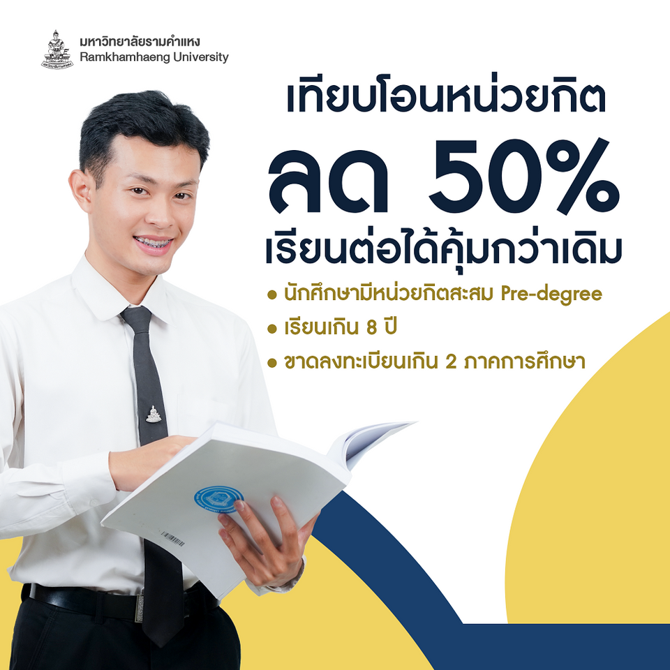 โปรพิเศษ!! ลดค่าเทียบโอนหน่วยกิต 50% สำหรับนักศึกษาเก่าที่ยังไม่สำเร็จการศึกษา และนักศึกษาระบบ Pre-degree