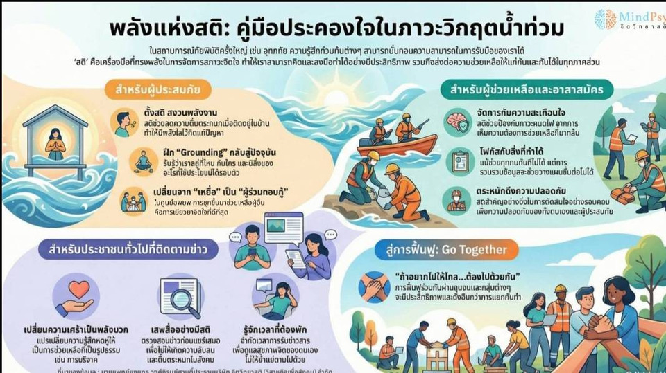 "สสส." สานพลัง "สวร." หนุนรัฐบาลฟื้นฟูสุขภาพใจประชาชน 10 จังหวัดภาคใต้ จากสถานการณ์น้ำท่วม เดินหน้าชวนใช้ “สติ 3 ขั้นตอน” รับมือวิกฤตภัยพิบัติ-ลดหวั่นวิตกว้าวุ่นใจ-จัดการปัญหาอย่างมีประสิทธิภาพ แนะระยะฟื้นฟู ต้องยึดหลัก “ไปด้วยกัน(Together Base)” เปลี่ยนเหยื่อเป็นผู้ร่วมกอบกู้วิกฤต สร้างพลังชุมชนเข้มแข็ง ร่วมเยียวยาใจ ลดปัญหาสุขภาพจิตระยะยาว