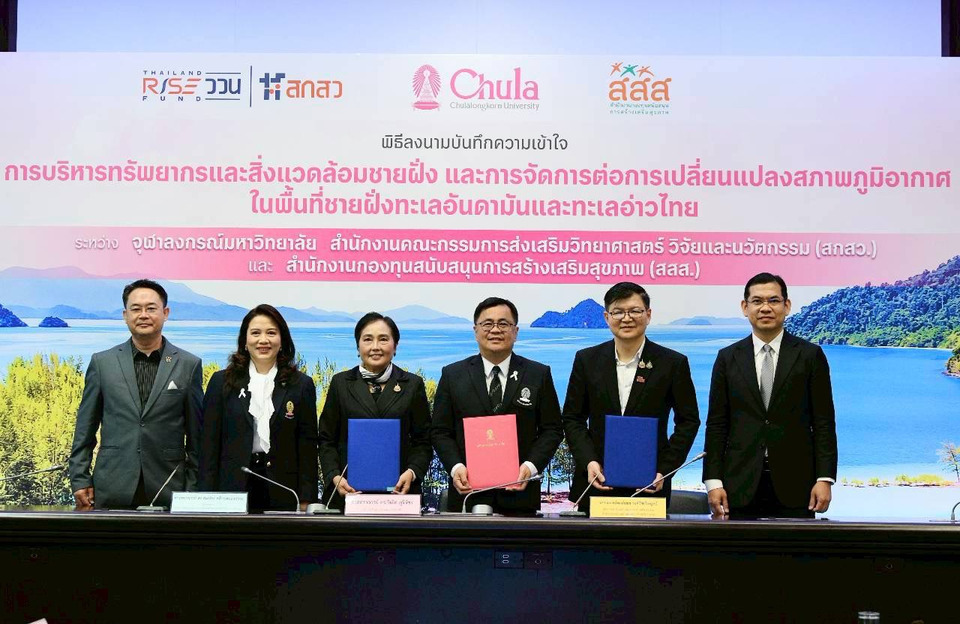 วันที่ 26 ธ.ค. 2568 เวลา 09.30 น. ที่จุฬาลงกรณ์มหาวิทยาลัย สำนักงานกองทุนสนับสนุนการสร้างเสริมสุขภาพ (สสส.) ร่วมกับ สำนักงานคณะกรรมการส่งเสริมวิทยาศาสตร์ วิจัยและนวัตกรรม (สกสว.) และจุฬาลงกรณ์มหาวิทยาลัย จัดพิธีลงนามบันทึกข้อตกลงความร่วมมือในการสนับสนุนการบริหารทรัพยากรและสิ่งแวดล้อมชายฝั่งและการจัดการต่อการเปลี่ยนแปลงสภาพภูมิอากาศ ในพื้นที่ชายฝั่งทะเลอันดามันและทะเลอ่าวไทย เพื่อสนับสนุนการบริหารจัดการทรัพยากรและสิ่งแวดล้อม และรับมือการเปลี่ยนแปลงสภาพภูมิอากาศในพื้นที่ชายฝั่ง ภายใต้แนวคิดการพัฒนาเชิงพื้นที่ (Area Based) และการพัฒนาที่ยั่งยืน (Sustainable Development Goals - SDGs)