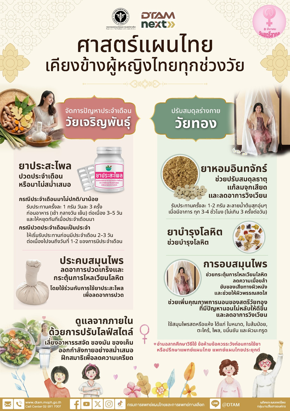 ทางด้าน ดร.รัชนี จันทร์เกษ ผู้อำนวยการสถาบันการแพทย์แผนไทย ให้รายละเอียดแนวทาง การใช้สมุนไพรและหัตถการในการดูแลสุขภาพสตรี ดังนี้ 1.กลุ่มสตรีวัยเจริญพันธุ์ (ปัญหาประจำเดือน) มักพบปัญหาปวดประจำเดือนหรือมาไม่สม่ำเสมอ แนะนำให้ใช้ “ยาประสะไพล” กรณีประจำเดือน มาไม่ปกติ/มาน้อย รับประทานครั้งละ 1 กรัม วันละ 3 ครั้ง ก่อนอาหาร (เช้า กลางวัน เย็น) ต่อเนื่อง 3–5 วัน และให้หยุดทันทีเมื่อประจำเดือนมา กรณีปวดประจำเดือนเป็นประจำ ให้เริ่มรับประทานก่อนมีประจำเดือน 2–3 วัน ต่อเนื่องไปจนถึงวันที่ 1-2 ของการมีประจำเดือน ที่สำคัญควรใช้ร่วมกับการ "ประคบสมุนไพร" บริเวณท้องน้อย เพื่อลดอาการปวดเกร็งและกระตุ้นการไหลเวียนโลหิต 2.กลุ่มสตรีวัยทอง (Menopause) เมื่อระดับฮอร์โมนลดลง มักมีอาการร้อนวูบวาบ นอนไม่หลับ หรืออารมณ์แปรปรวน แนะนำ “ยาหอมอินทจักร์” รับประทานครั้งละ 1-2 กรัม ละลายน้ำต้มสุกอุ่นๆ เมื่อมีอาการ ทุก 3-4 ชั่วโมง (ไม่เกิน 3 ครั้งต่อวัน) สรรพคุณ ช่วยปรับสมดุลธาตุ แก้ลมจุกเสียด และลดอาการวิงเวียน “ยาบำรุงโลหิต” สรรพคุณบำรุงโลหิต ที่สำคัญอ่านฉลากศึกษาวิธีใช้ข้อห้าม ข้อควรระวังก่อนการใช้ยา หรือปรึกษาแพทย์แผนไทย แพทย์แผนไทยประยุกต์