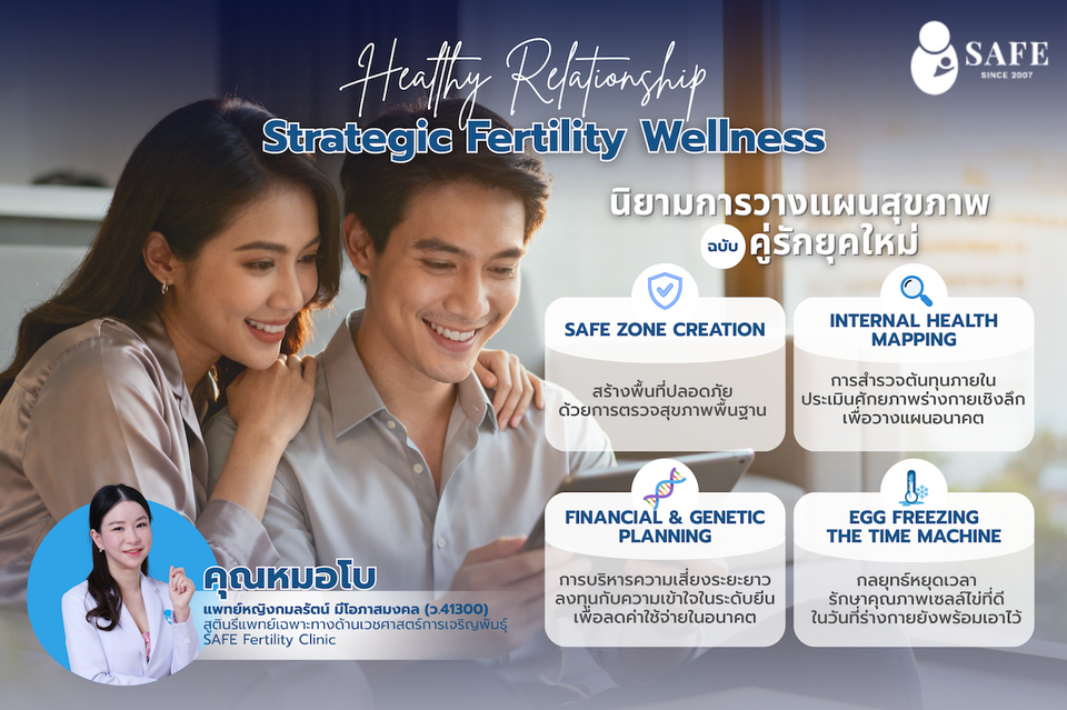 ซึ่งสอดคล้องไปกับการวางบทบาท SAFE Fertility Clinic ในฐานะการเป็นที่ปรึกษา เป็นตัวช่วยของคู่รัก ของการเริ่มต้นสุขภาพได้อย่างปลอดภัย เข้าใจง่าย โดยคุณหมอโบ ได้ให้หลักการวางแผน "Strategic Fertility Wellness" การบริหารจัดการต้นทุนชีวิตฉบับคู่รักยุคใหม่ที่ต้องการความพร้อมและความมั่นคงทางชีวิตก่อนเริ่มวางแผนครอบครัว