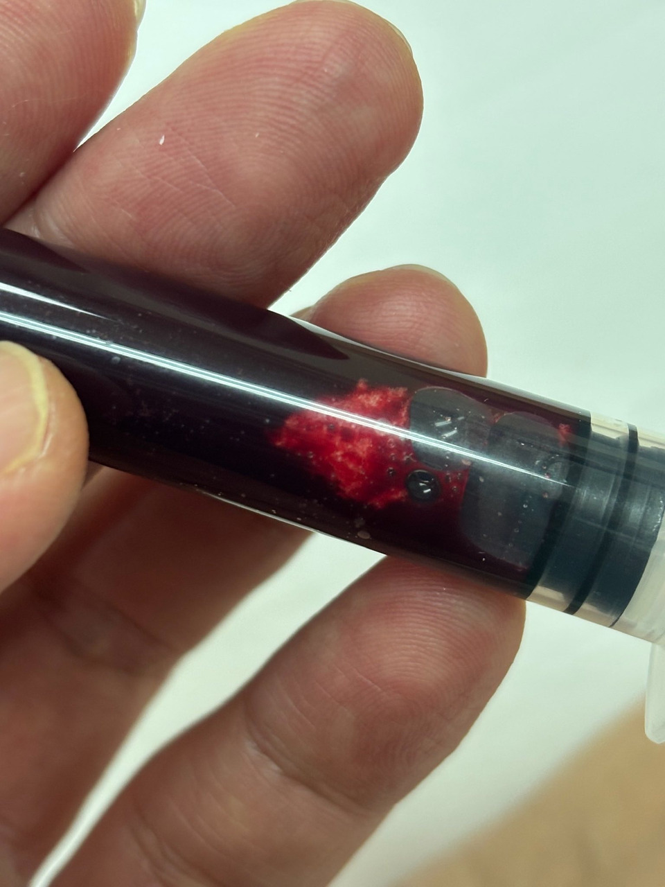 ลำพังดูจากเลือดที่เจาะออกมานี้ แค่มองก็จะเห็นว่ามี”ก้อน“ที่สงสัยว่าเป็น fibrin mass หลุดออกมา กลิ้งขาวๆในหลอดใส่เลือดนี้ ซึ่งในคนที่ขาดน้ำจะยิ่งมีเจ้านี่มากวนชัดขึ้นครับ