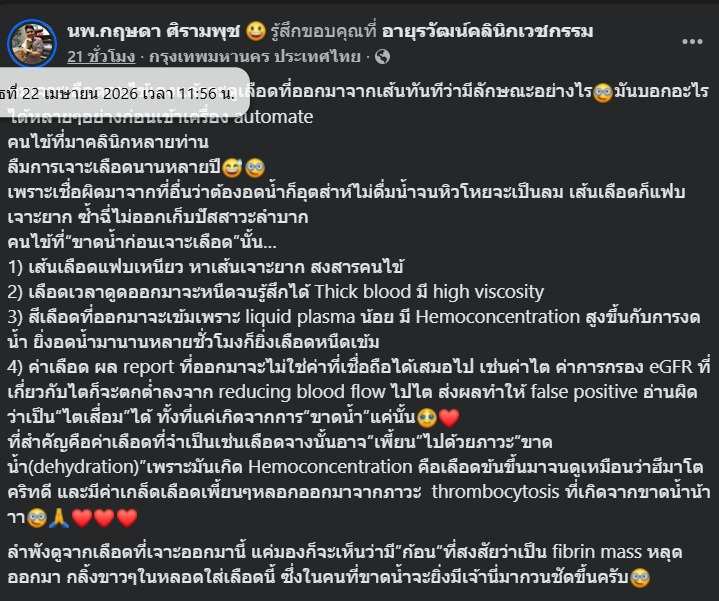 วันที่ 23 เม.ย.69 นพ.กฤษดา ศิรามพุช แพทย์ชะลอวัย ผู้อำนวยการศูนย์เวชศาสตร์อายุรวัฒน์นานาชาติ โพสต์ข้อความผ่านเฟซบุ๊ก นพ.กฤษดา ศิรามพุช ระบุว่า..