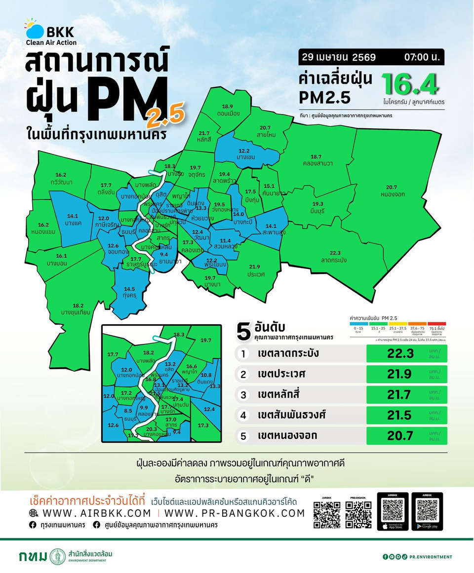 ศูนย์ข้อมูลคุณภาพอากาศกรุงเทพมหานคร รายงานสถานการณ์ฝุ่นละออง PM2.5 ประจำเช้าวันที่ 29 เมษายน 2569 เวลา 07:00 น. พบว่าสภาพอากาศในพื้นที่กรุงเทพฯ ส่วนใหญ่อยู่ใน "เกณฑ์ดีถึงดีมาก" โดยมีค่าเฉลี่ยทั้งกรุงเทพมหานครอยู่ที่ 16.4 มคก./ลบ.ม. (ค่ามาตรฐานต้องไม่เกิน 37.5 มคก./ลบ.ม.)