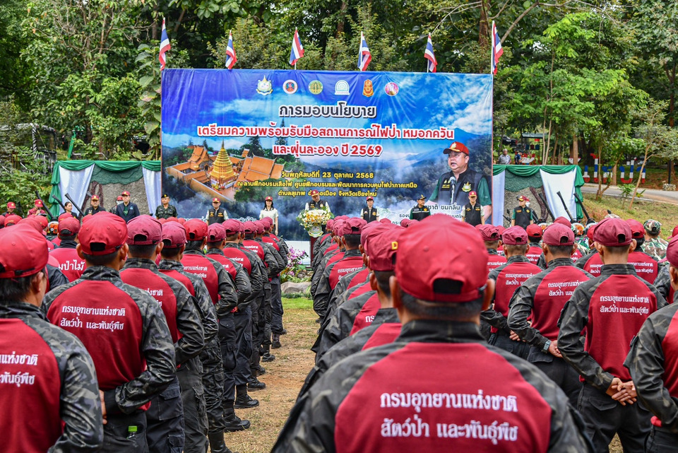 วันที่ 23 ตุลาคม 2568 เวลา 15.00 น. นายสุชาติ ชมกลิ่น รองนายกรัฐมนตรีและรัฐมนตรีว่าการกระทรวงทรัพยากรธรรมชาติและสิ่งแวดล้อม เป็นประธานการประชุมมอบนโยบายและรับฟังความคิดเห็น เพื่อเตรียมความพร้อมในการป้องกันและแก้ไขปัญหาไฟป่า หมอกควัน และฝุ่นละอองขนาดเล็ก (PM2.5) ประจำปี 2569 ณ ศูนย์ปฏิบัติการไฟป่าเชียงใหม่ ตำบลสุเทพ อำเภอเมืองเชียงใหม่ จังหวัดเชียงใหม่ และผ่านระบบ Video Conference เชื่อมต่อไปยัง 20 จังหวัดเฝ้าระวัง และหน่วยงานในสังกัดกระทรวงฯ ทั่วประเทศพร้อมเปิด “ศูนย์ปฏิบัติการไฟป่าและหมอกควันภาคเหนือ” อย่างเป็นทางการ โดยมี ดร.ชญานันท์ ภักดีจิตต์ ปลัดกระทรวงทรัพยากรธรรมชาติและสิ่งแวดล้อม นายทศพล เผื่อนอุดม ผู้ว่าราชการจังหวัดเชียงใหม่ และผู้บริหารหน่วยงานในสังกัดกระทรวงฯ ที่เกี่ยวข้อง ตลอดจนผู้แทนหน่วยงานภาครัฐ ภาคเอกชน องค์กรปกครองส่วนท้องถิ่น และภาคประชาชน เข้าร่วมประชุม และร่วมเสนอข้อคิดเห็น