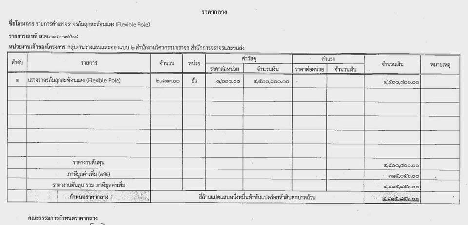 จากที่ เพจเฟซบุ๊ก "ชมรม strongต้านทุจริตประเทศไทย" โพสต์ข้อความตั้งข้อสังเกต โครงการรายการค่าเสาจราจรล้มลุกสะท้อนแสง (Flexible Pole) รายการเลขที่ สวจ.๐๑๖-๐๗/๒๘ รายการเสาจราจรล้มลุกสะท้อนแสง (Flexible Pole) จำนวน 2,813 อัน กำหนดราคาอันละ 1,600 บาท รวมเป็นงบประมาณ 4.8 ล้านบาท