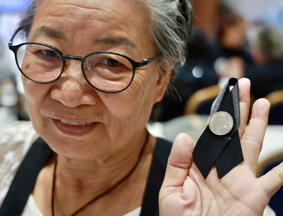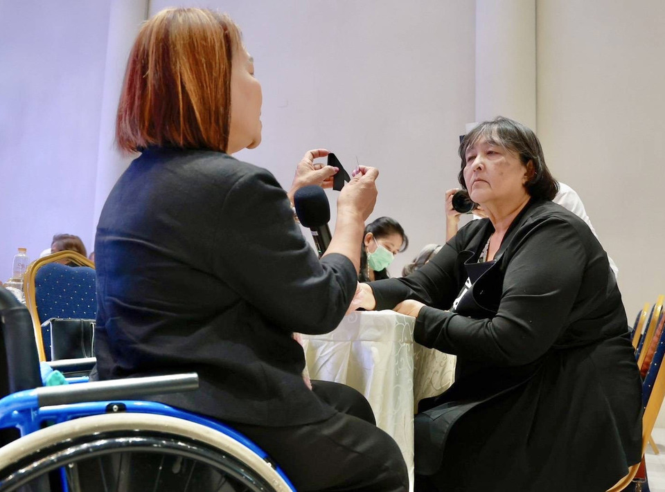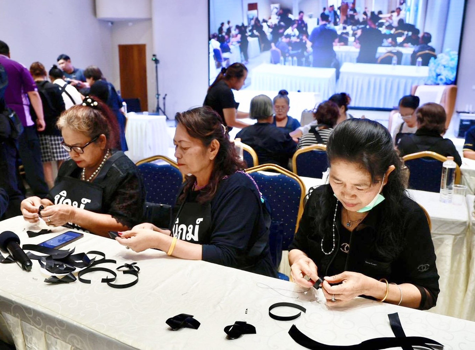 สมาคมคนพิการ เขตลาดกระบัง ประดิษฐ์ริบบิ้นไว้อาลัยแก่จิตอาสา จำนวน 40 คน จากเขตลาดกระบัง เพื่อให้จิตอาสาเหล่านี้สามารถนำความรู้ไปต่อยอดสอนคนในชุมชนของตนเองในการทำริบบิ้นไว้อาลัยต่อไป โดยตั้งเป้าทำริบบิ้นไว้อาลัย จำนวน 1,000 ชิ้น เพื่อนำไปแจกจ่ายให้กับประชาชนที่จะเดินทางไปร่วมถวายความอาลัย ที่สนามหลวง