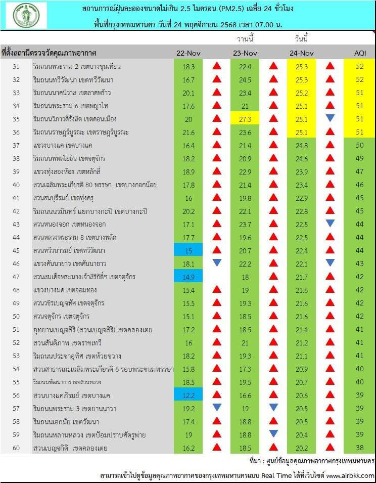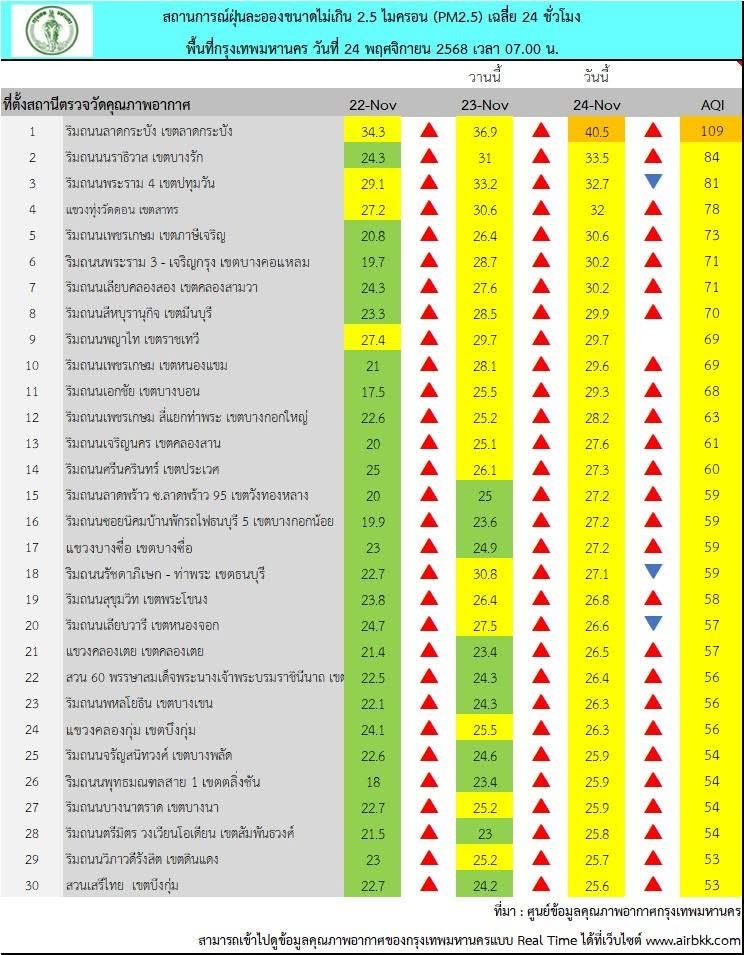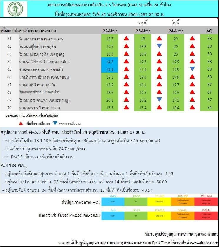 วันที่ 24 พฤศจิกายน พ.ศ. 2568 เวลา 07.00 น. ศูนย์ข้อมูลคุณภาพอากาศกรุงเทพมหานคร ได้รายงานสถานการณ์ฝุ่นละอองขนาดไม่เกิน 2.5 ไมครอน (PM2.5) ของสถานีตรวจวัดคุณภาพอากาศทั่วพื้นที่กรุงเทพมหานคร พบค่าเฉลี่ย 24 ชั่วโมง ตรวจวัดได้ในช่วง 18.4-40.5 ไมโครกรัมต่อลูกบาศก์เมตร (มคก./ลบ.ม.) โดยภาพรวมคุณภาพอากาศส่วนใหญ่อยู่ในระดับปานกลาง แต่พบพื้นที่ที่ค่าฝุ่นเกินมาตรฐานและเริ่มมีผลกระทบต่อสุขภาพ (ระดับสีส้ม) จำนวน 1 พื้นที่ ได้แก่ บริเวณด้านหน้าโรงพยาบาลนคราภิบาล เขตลาดกระบัง ซึ่งตรวจวัดค่าได้สูงสุดที่ 40.5 มคก./ลบ.ม. เกินกว่าค่ามาตรฐานที่กำหนดไว้ไม่เกิน 37.5 มคก./ลบ.ม.