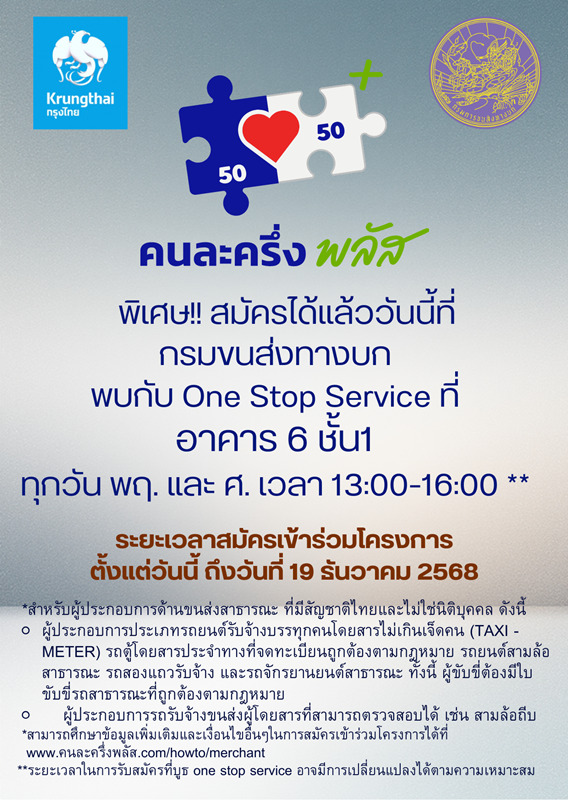 กรมการขนส่งทางบกได้ร่วมกับธนาคารกรุงไทยจัดตั้งจุดบริการรับลงทะเบียนเข้าร่วม “คนละครึ่ง พลัส” ภายในอาคาร 6 ชั้น 1 ของกรมการขนส่งทางบก โดยเปิดให้บริการทุกวันพฤหัสบดีและวันศุกร์ของสัปดาห์ ตั้งแต่วันที่ 27 พฤศจิกายน 2568 จนถึงวันที่ปิดรับลงทะเบียนสำหรับผู้ประกอบการในวันที่ 19 ธันวาคม 2568 เพื่อให้ผู้ประกอบการที่เดินทางมาติดต่อราชการด้านทะเบียนหรือภาษีรถที่กรมฯ สามารถสมัครเข้าร่วมโครงการได้ทันทีในรูปแบบ One Stop Service โดยไม่ต้องเสียเวลาเดินทางไปยังสาขาธนาคารเพิ่มเติม
