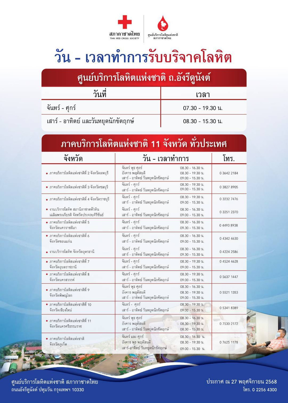 เมื่อวันที่ 29พ.ย.68 เพจเฟซบุ๊ก "ศูนย์บริการโลหิตแห่งชาติ สภากาชาดไทย" โพสต์ข้อควมระบุว่า เนื่องจาก ภาคบริการโลหิตแห่งชาติที่ 12 จังหวัดสงขลา ตั้งอยู่ใน อ.หาดใหญ่ จ.สงขลา อยู่ในพื้นที่อุทกภัย