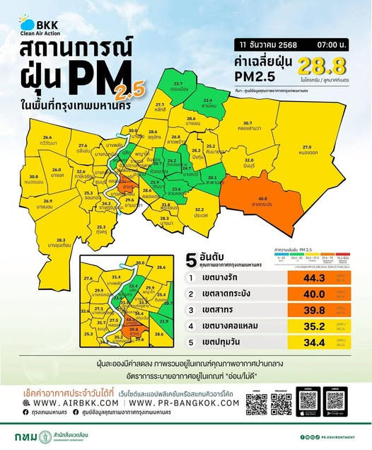 วันที่ 11 ธันวาคม 2568 เวลา 07.00 น. ศูนย์ข้อมูลคุณภาพอากาศกรุงเทพมหานคร ขอรายงานสถานการณ์ฝุ่นละอองขนาดไม่เกิน 2.5 ไมครอน (PM 2.5) ในกรุงเทพมหานคร ค่าเฉลี่ยของกรุงเทพมหานคร 28.8 ไมโครกรัมต่อลูกบาศก์เมตร (มคก./ลบ.ม.) (ค่ามาตรฐาน 37.5 มคก./ลบ.ม.)