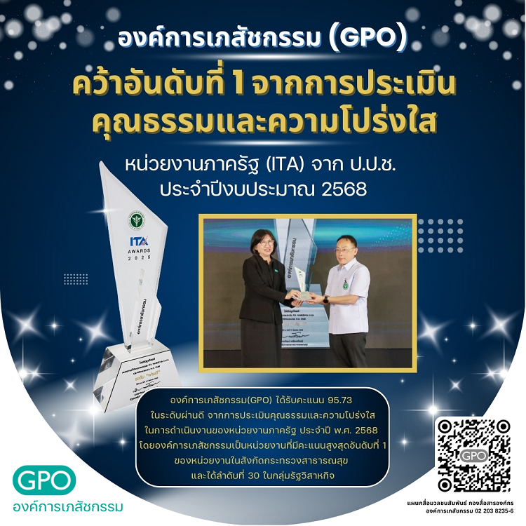 องค์การเภสัชกรรม (GPO) คว้าอันดับที่ 1 จากการประเมินคุณธรรมและความโปร่งใสของหน่วยงานภาครัฐ (ITA) จาก ป.ป.ช. ประจำปีงบประมาณ 2568