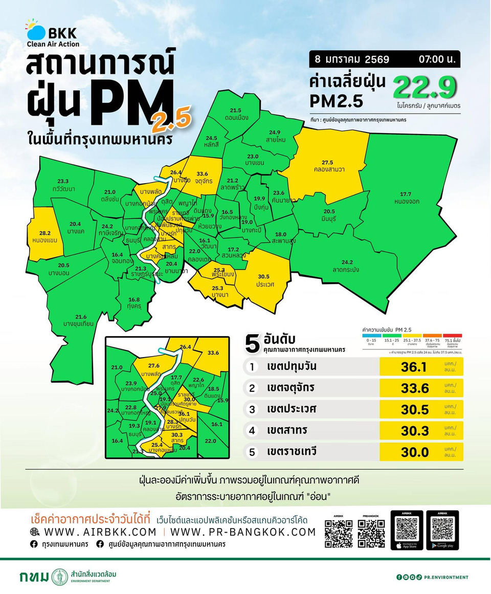 วันที่ 8 ม.ค.69 ศูนย์ข้อมูลคุณภาพอากาศกรุงเทพมหานคร รายงานสถานการณ์ฝุ่นละอองขนาดไม่เกิน 2.5 ไมครอน (PM 2.5) ในกรุงเทพมหานคร ประจำวันที่ 8 มกราคม 2569 เวลา 07:00 น.