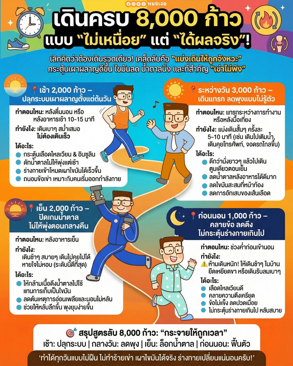 สรุปให้เข้าใจง่ายนะครับ 8,000 ก้าว ไม่จำเป็นต้องเดินรวดเดียว แต่ต้อง “กระจายให้ถูกเวลา” เช้าเพื่อปลุกระบบ กลางวันเพื่อลดพุง เย็นเพื่อล็อกน้ำตาล และก่อนนอนเพื่อฟื้นตัว แค่นี้ก็ได้ผลทั้งเผาไขมัน ลดอักเสบ และไม่ทำร้ายเข่า ทำได้ทุกวันแบบไม่ฝืน ร่างกายจะเปลี่ยนจริงครับ