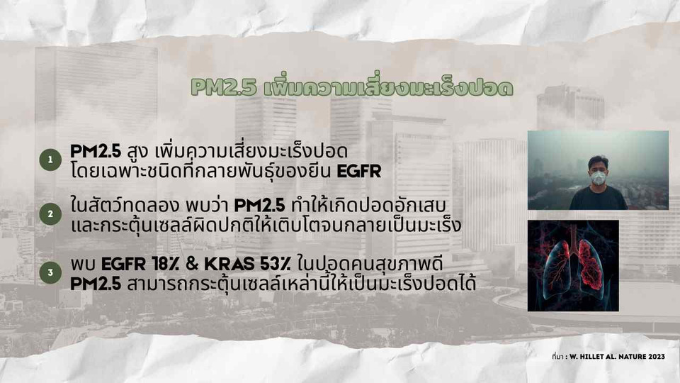 “ปัจจัยเสี่ยงของ PM2.5 ต่อการเกิดมะเร็งปอด ความเสี่ยงอยู่ที่ประมาณ 10-20 เปอร์เซ็นต์ เมื่อเทียบกับคนที่ไม่ได้อยู่ในสภาพแวดล้อมที่มี PM2.5 ซึ่งเป็นตัวเลขที่น่ากังวล และเราก็มีข้อมูลเพิ่มว่า PM2.5 เพิ่มปัจจัยเสี่ยงในการที่จะเป็นมะเร็งปอด รวมทั้งข้อมูลของคนที่อยู่ในโซนที่เป็น PM2.5 เยอะ เทียบกับ PM2.5 น้อย อัตราการเกิดมะเร็งปอดก็มากกว่าด้วย เพราะฉะนั้นก็ถือได้ว่า PM2.5 นับเป็นปัจจัยเสี่ยงที่ต้องคอยเฝ้าระวังในทุกวันนี้”