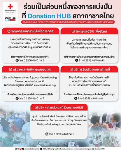 Donation HUB สภากาชาดไทย ศูนย์รวมการบริจาคและจัดกิจกรรมหารายได้เพื่อสนับสนุนทุกภารกิจการช่วยเหลือของสภากาชาดไทย เดินหน้าภารกิจ “รับ” เพื่อ “ให้” ภายใต้วิสัยทัศน์ Smart Fundraising เชิญชวนประชาชน และองค์กรทุกภาคส่วน ร่วมเป็นส่วนหนึ่งของการขับเคลื่อนภารกิจด้านมนุษยธรรม เพื่อส่งต่อความช่วยเหลือไปยังผู้ป่วย ผู้ประสบภัย และกลุ่มเปราะบางทั่วประเทศ โดยเปิดโอกาสให้ผู้มีจิตศรัทธาได้ส่งต่อน้ำใจไปยังพี่น้องประชาชนที่ต้องการความช่วยเหลือ ผ่านรูปแบบการบริจาคและกิจกรรมการกุศลที่หลากหลาย ทั้งออฟไลน์และออนไลน์ ประกอบด้วย