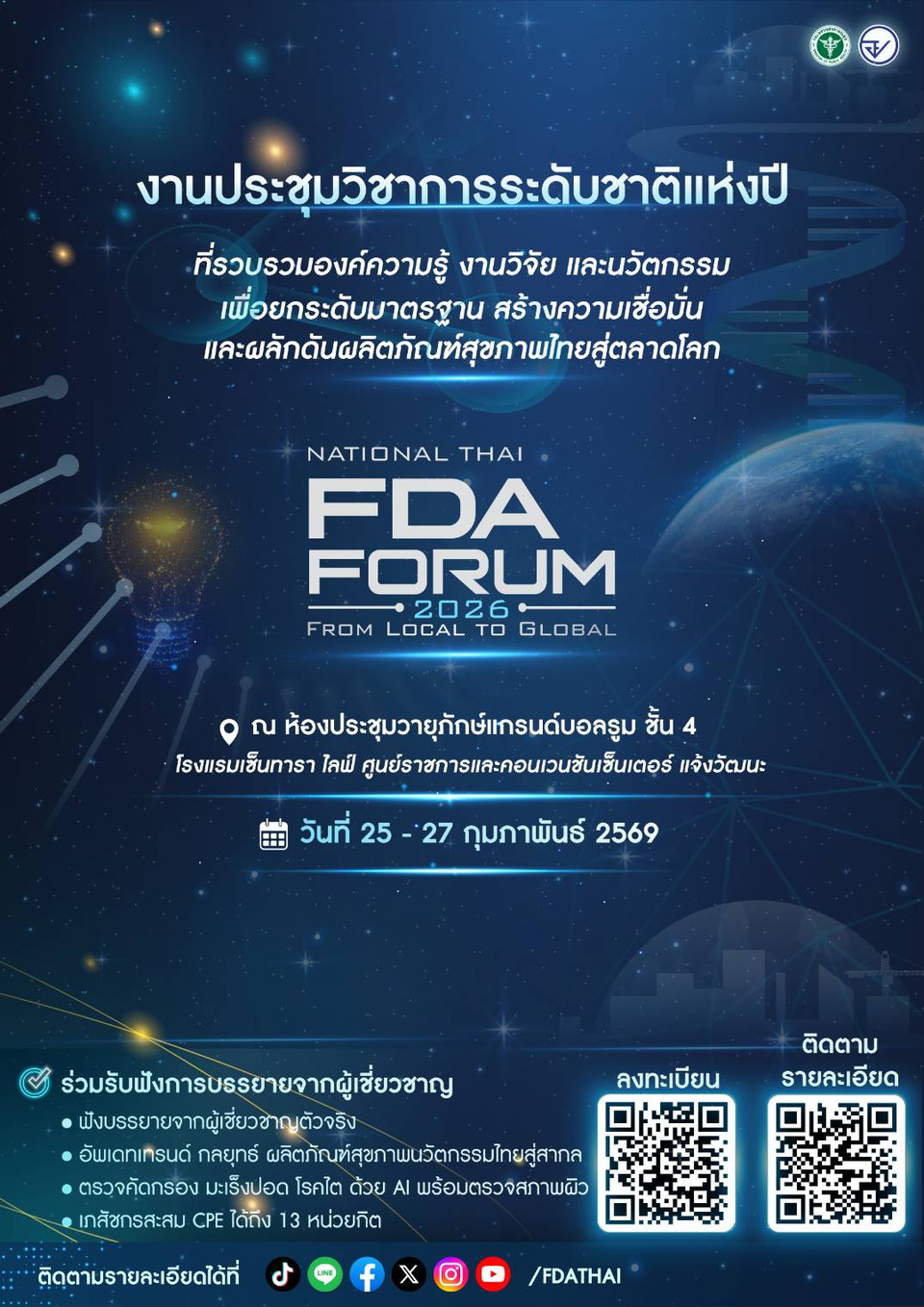 ผู้เข้าร่วมงานยังสามารถสะสมหน่วยกิตการศึกษาต่อเนื่อง (CPE) ได้สูงสุด 13 หน่วยกิต โดยไม่มีค่าใช้จ่าย งาน “National Thai FDA Forum 2026” ถือเป็นเวทีวิชาการระดับชาติที่เชื่อมโยงภาครัฐ นักวิชาการ และภาคอุตสาหกรรม เพื่อร่วมกันยกระดับมาตรฐานผลิตภัณฑ์สุขภาพ สร้างความเชื่อมั่นให้ผู้บริโภค และขับเคลื่อนประเทศไทยสู่การเป็นศูนย์กลางด้านผลิตภัณฑ์สุขภาพในระดับสากล ผู้สนใจสามารถลงทะเบียนเข้าร่วมงาน และติดตามรายละเอียดเพิ่มเติมได้ผ่านช่องทางของสำนักงานคณะกรรมการอาหารและยา (อย.)