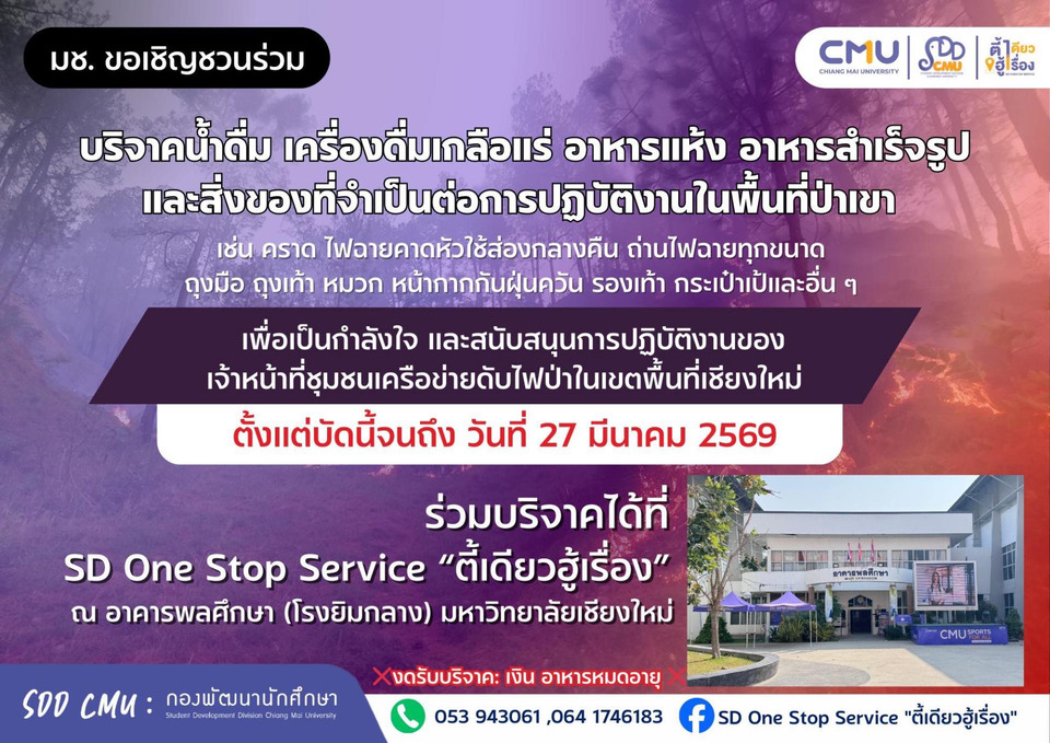 ผู้มีจิตศรัทธาสามารถร่วมบริจาคได้ที่จุดรับบริจาค SD One Stop Service “ตี้เดียวฮู้เรื่อง” ณ อาคารพลศึกษา (โรงยิมกลาง) มหาวิทยาลัยเชียงใหม่ พิกัด: https://cmu.to/q3MqA ตั้งแต่วันนี้จนถึงวันที่ 27 มีนาคม 2569 พร้อมสอบถามรายละเอียดเพิ่มเติมได้ทาง Facebook Page: SD One Stop Service “ตี้เดียวฮู้เรื่อง” หรือโทรศัพท์ 053-943061 และ 064-1746183