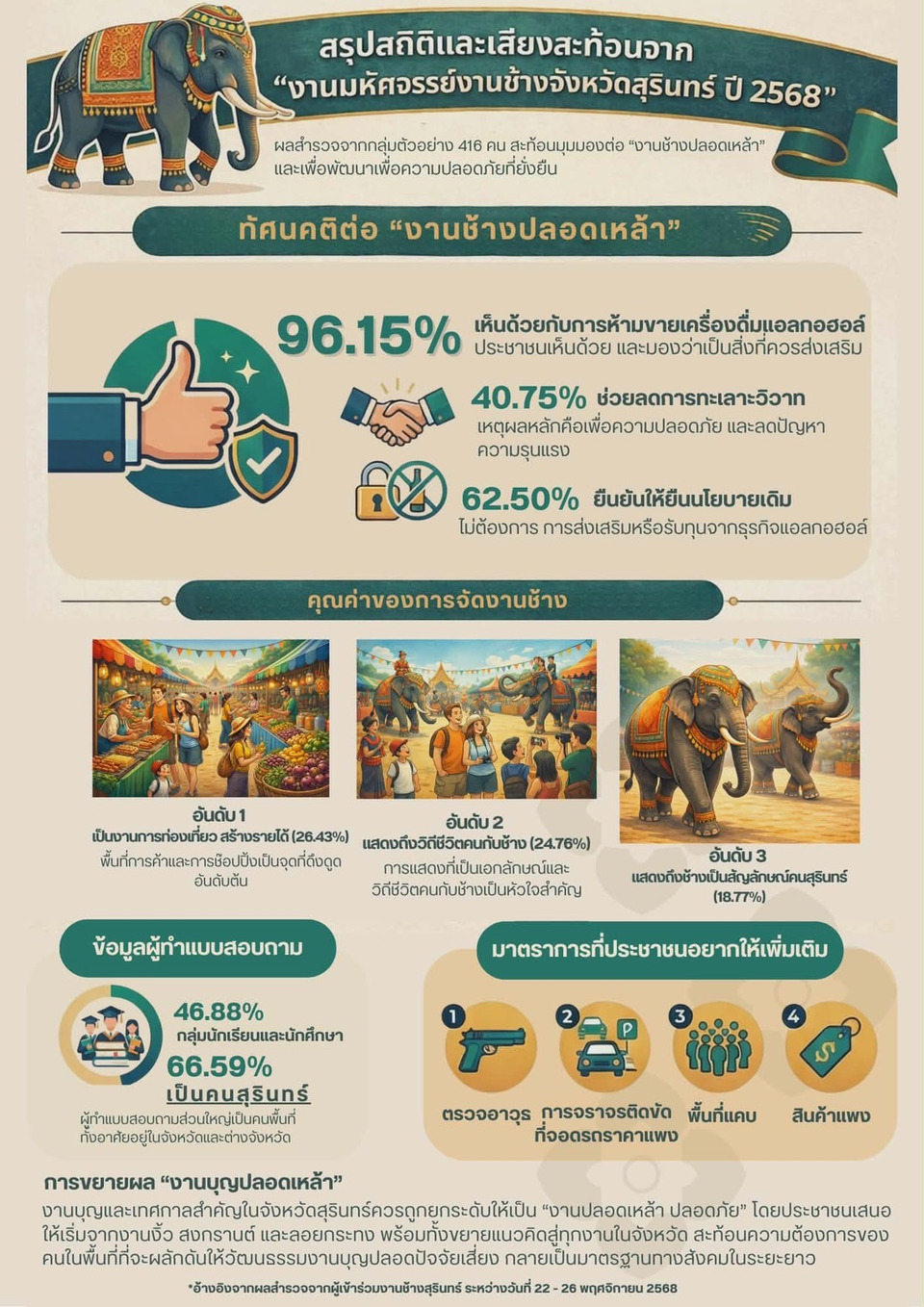 งานช้างสุรินทร์ไม่กินสุรา ถอดบทเรียนความปลอดภัยได้ผล ผนึกกำลังบังคับใช้กฎหมาย ลดการกระทำผิด 85% ผลสำรวจงานช้างปลอดภัยเอกฉันท์ 96% ย้ำข้อเสนอยกระดับจัดงานให้สัมผัสวิถีคนกับช้าง สินค้าชุมชนกระจายรายได้ เพิ่มคุณค่าการท่องเที่ยวยั่งยืน