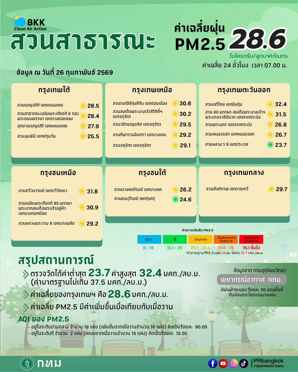 วันที่ 26 ก.พ.69 ศูนย์ข้อมูลคุณภาพอากาศกรุงเทพมหานครขอสรุปผลการตรวจวัด PM2.5 ประจำ วันที่ 26 กุมภาพันธ์ 2569เวลา 05.00-07.00 น. (3 ชั่วโมงล่าสุด) ตรวจวัดได้ 23.7-40.9 มคก./ลบ.ม. ค่าเฉลี่ยของกรุงเทพมหานคร 31.8 มคก./ลบ.ม.(ค่ามาตรฐานไม่เกิน 37.5 มค.ก./ลบ.ม.) ค่า PM2.5 มีแนวโน้มเพิ่มขึ้น เกินมาตรฐานจำนวน 6 พื้นที่ และเริ่มมีผลกระทบต่อสุขภาพ จำนวน 6 พื้นที่ ทั้งนี้ ณ เวลา 07.00 น. ตรวจวัดค่าฝุ่นละออง PM2.5 ได้ในช่วง 23.7-40.8 ไมโครกรัม/ลูกบาศก์เมตร (มคก./ลบ.ม.) โดยมีแนวโน้มเพิ่มขึ้น เมื่อเทียบกับเมื่อวานในช่วงเวลาเดียวกัน และ พบว่าเกินมาตรฐานอยู่ในระดับสีส้ม