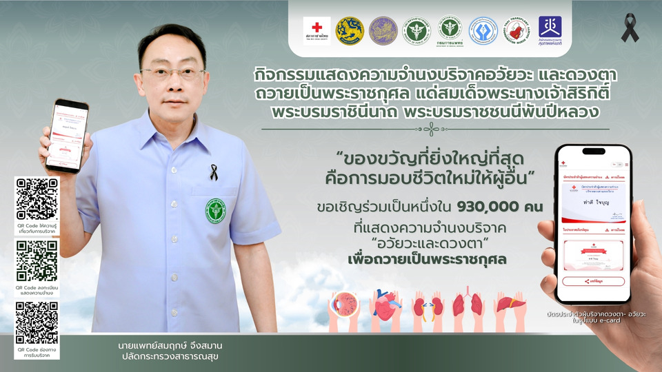 สธ.จับมือ 6 หน่วยงาน เชิญชวนคนไทยสร้างบุญใหญ่ บริจาคอวัยวะ-ดวงตา เป้าหมาย 9.3 แสนราย ถวายเป็นพระราชกุศล “สมเด็จพระพันปีหลวง”
