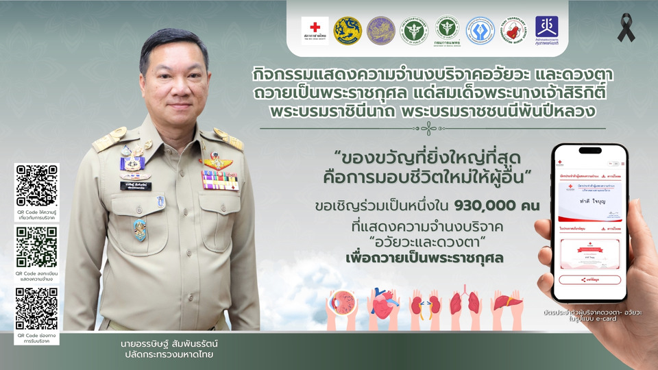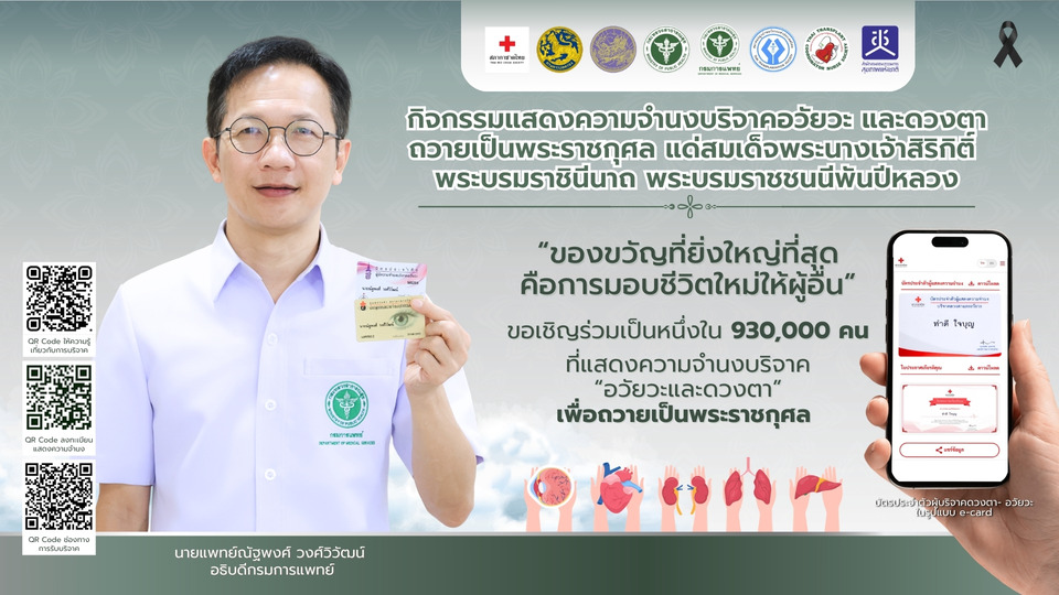 กระทรวงสาธารณสุข ร่วมกับ สภากาชาดไทย กระทรวงคมนาคม กระทรวงมหาดไทย ชมรมพยาบาลประสานงานการปลูกถ่ายอวัยวะแห่งประเทศไทย สมาคมปลูกถ่ายอวัยวะแห่งประเทศไทย และคณะกรรมการสุขภาพแห่งชาติ เชิญชวนประชาชนร่วมสร้างกุศลยิ่งใหญ่ แสดงความจำนงเป็นผู้บริจาคอวัยวะและดวงตา สืบสานพลังแห่งการให้ สร้างโอกาสแก่เพื่อนมนุษย์และผู้ป่วยระยะสุดท้าย เพื่อถวายเป็นพระราชกุศลแด่สมเด็จพระนางเจ้าสิริกิติ์ พระบรมราชินีนาถ พระบรมราชชนนีพันปีหลวง ตั้งเป้า 930,000 ราย ภายในปีนี้